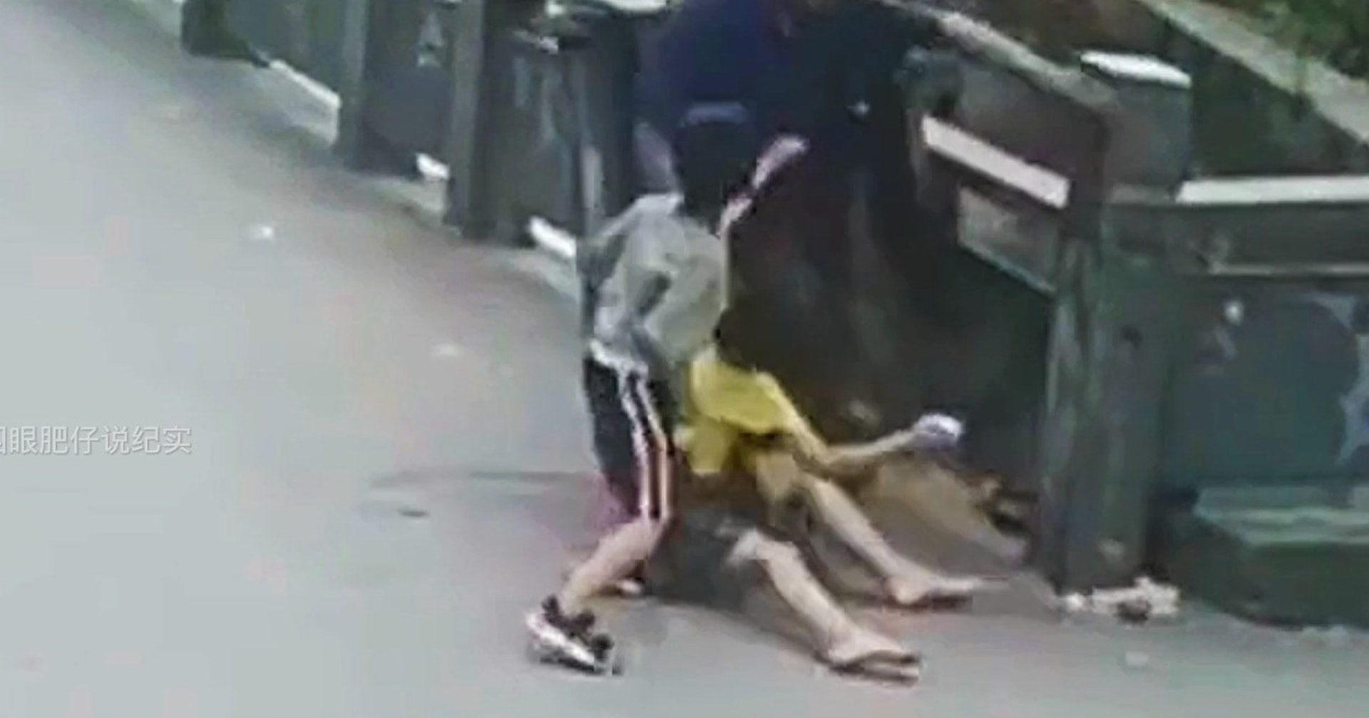 & O9 P" i$ M( D. R q- o公仔箱論壇面對小男孩狙擊,男子邊拉着女童邊後退,終被身後垃圾桶綁倒跌在地上,鬆手放開了女童。(影片截圖)