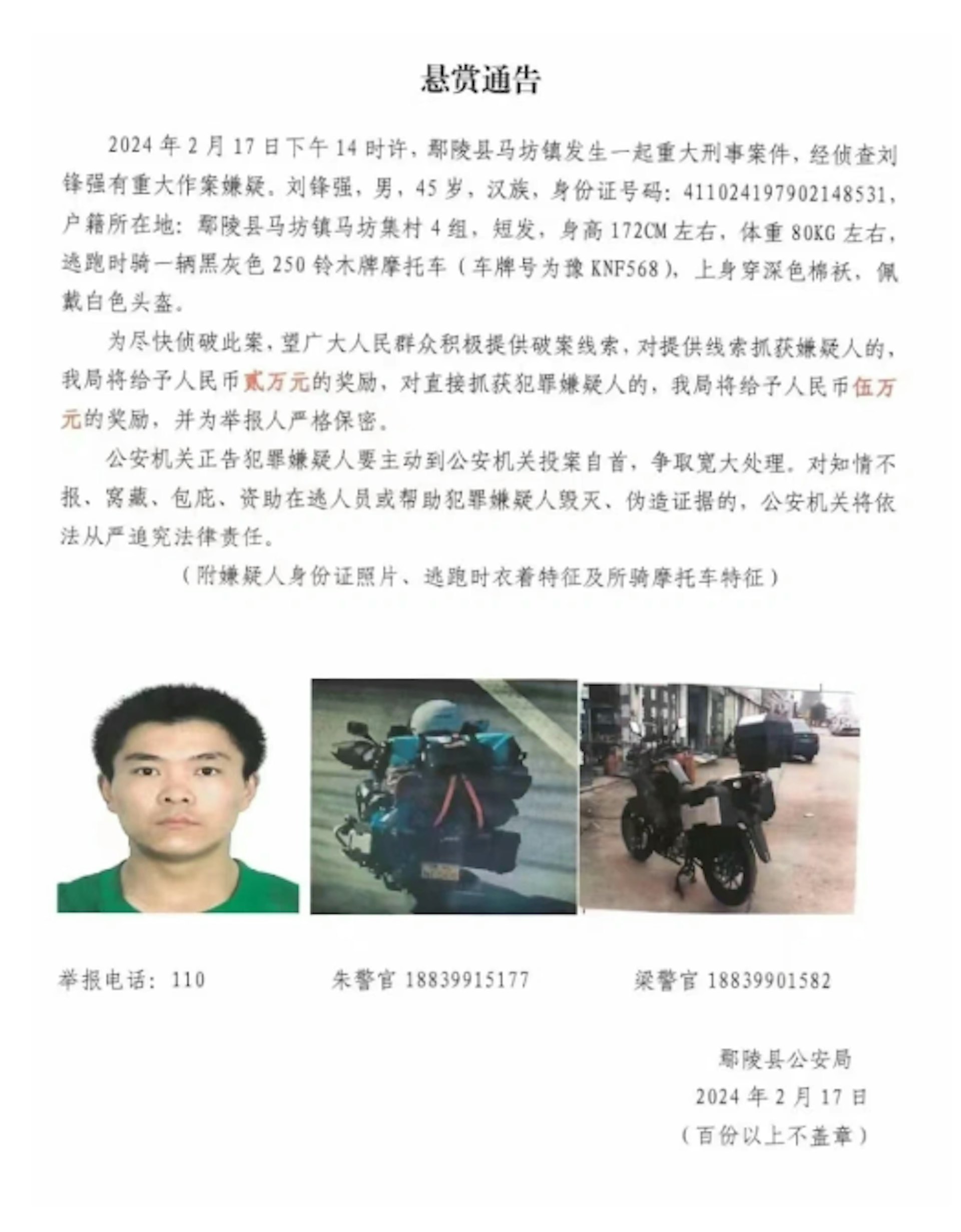 據警方此前通報,2024年2月17日下午14時許,河南鄢陵縣馬坊鎮發生一起重大刑事案件,經偵查,45歲的當地村民劉鋒強有重大犯案嫌疑。公仔箱論壇: p( X, k/ u6 ?5 F* |! h2 [