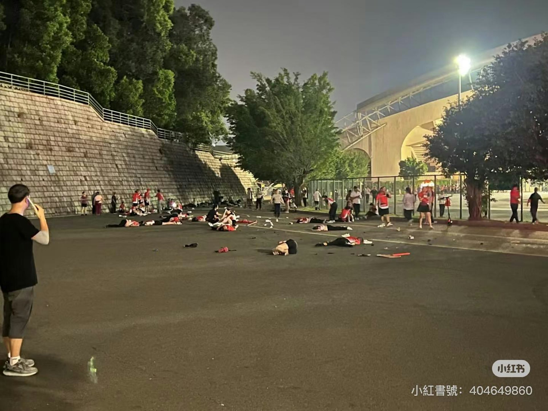 ! B. C+ R1 G0 b1 J" o5.39.217.77倒地的傷者除了有穿著不同顏色運動服的隊員,還有著路人服裝等。有倒在地上的人手上還拿著旗子。
