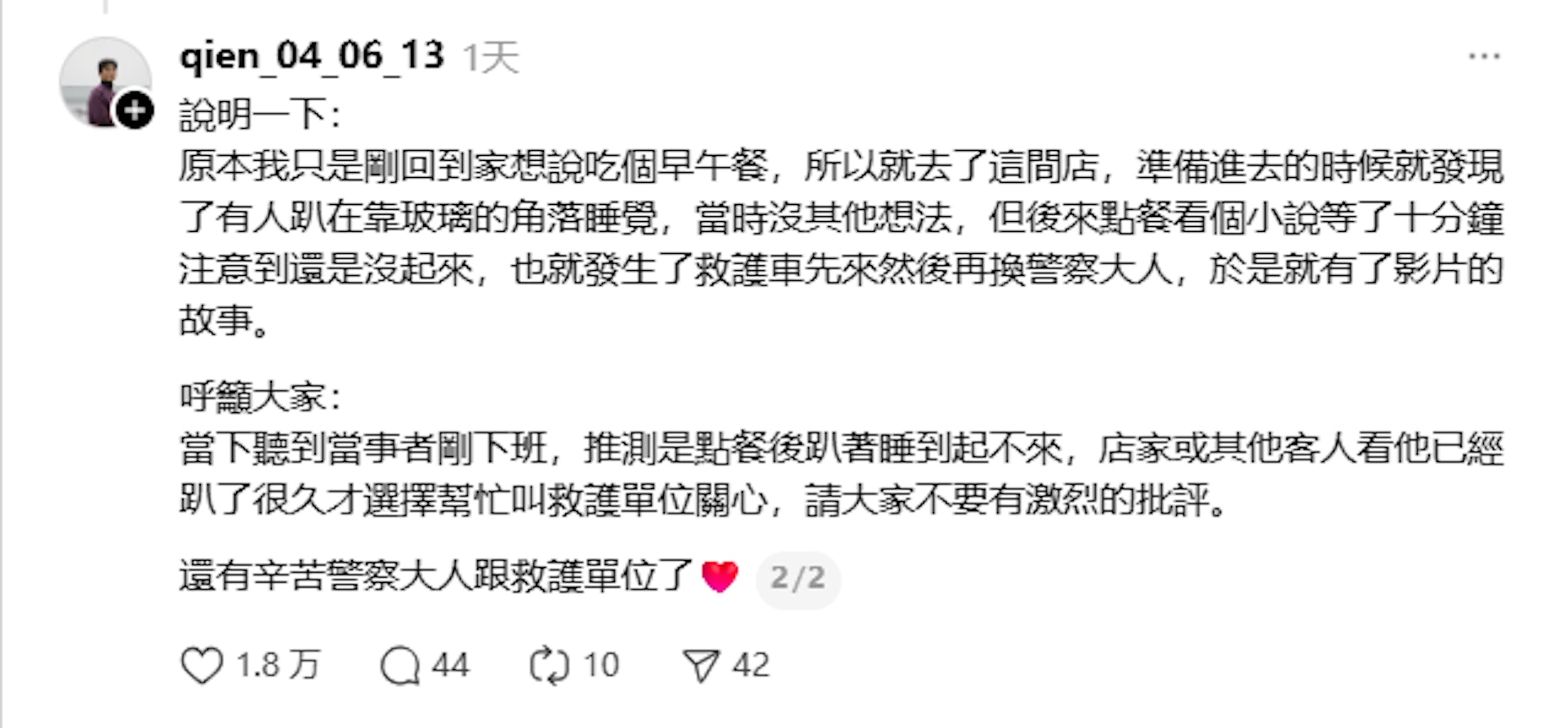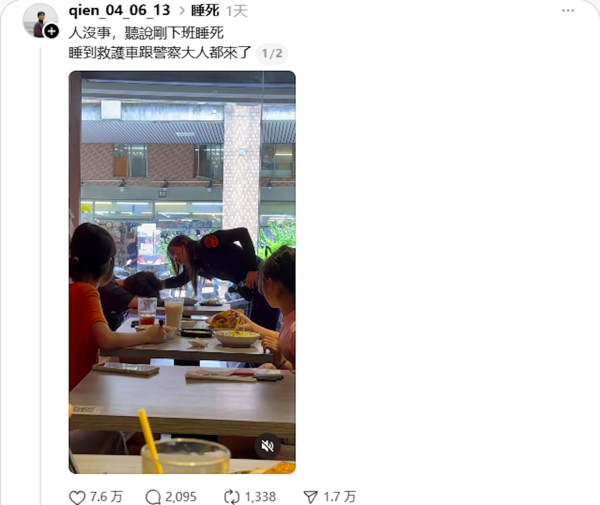 台灣新北市汐止區一間早餐店昨日(9月21日)上午發生女顧客用餐時突然趴在桌上睡死,獲報趕來處理的警員中,其中一位女警成功將女顧客喚醒,不過她的超高顏值卻讓現場氣氛高漲,引發網友高度關注。