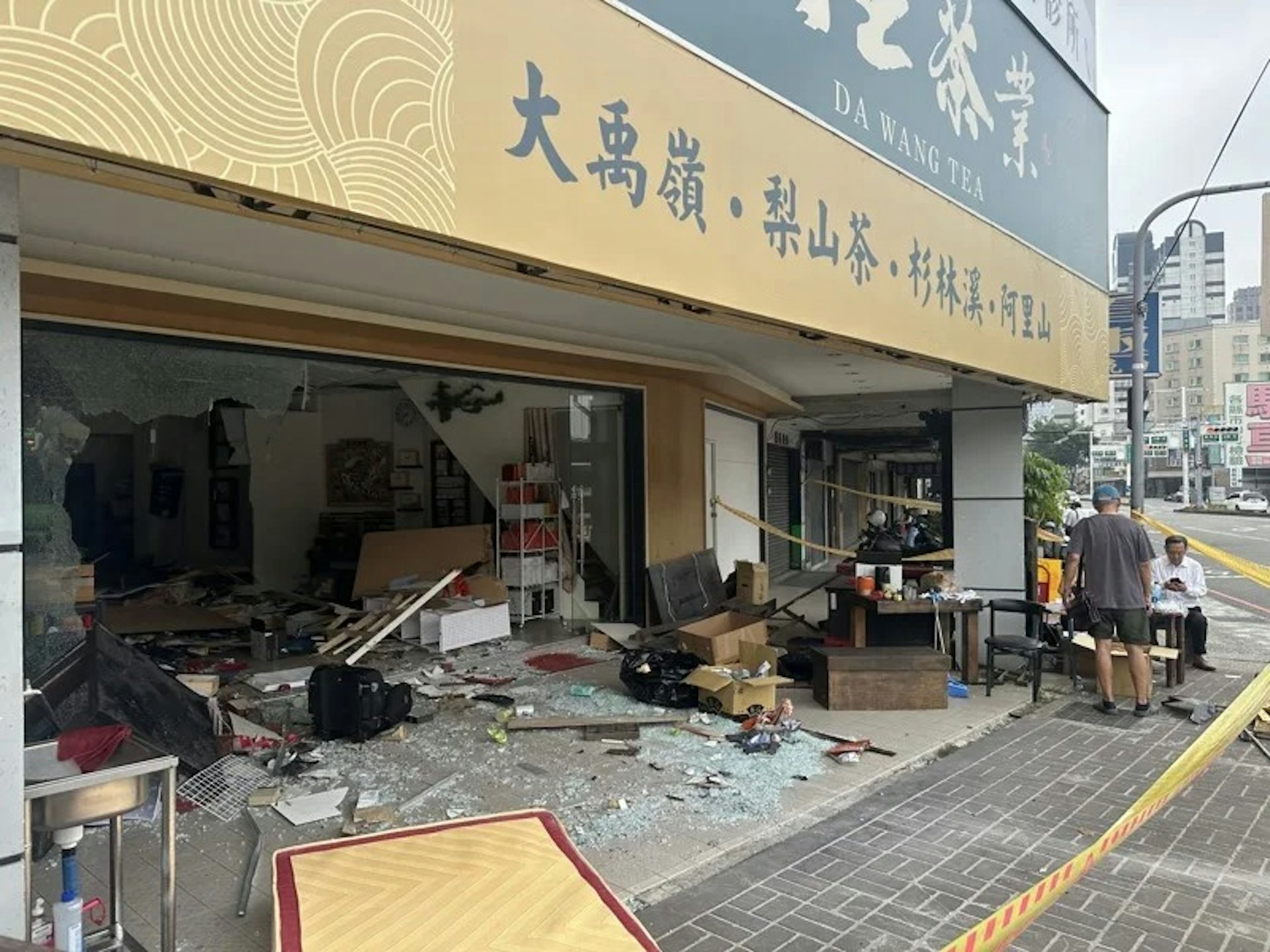 $ O d I- q) `8 o3 V7 c劉男駕駛藍色BMW,從五權西路迎面而來,宛如砲彈般高速直衝入茶葉行,現場一片狼籍,就肇事車BMW的前車牌都還掉在現場。(聯合新聞網授權使用)