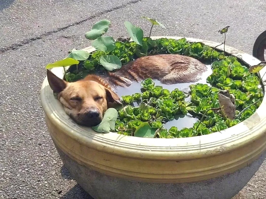 亂入一隻泡澡的狗哥,小荷才露尖尖角,早有狗子卧上頭。(有喵青年提供)