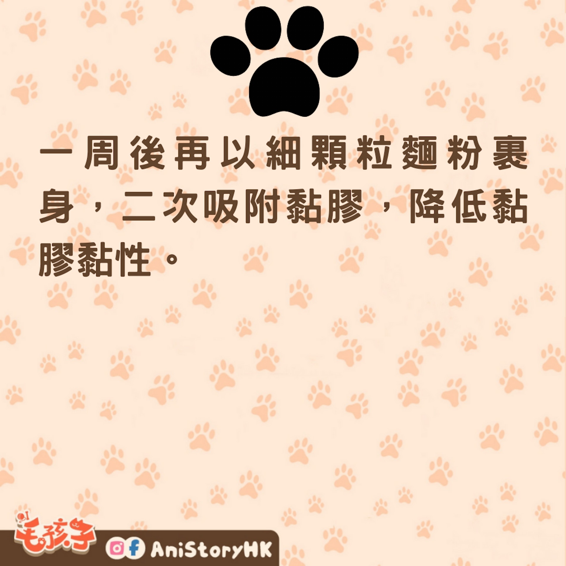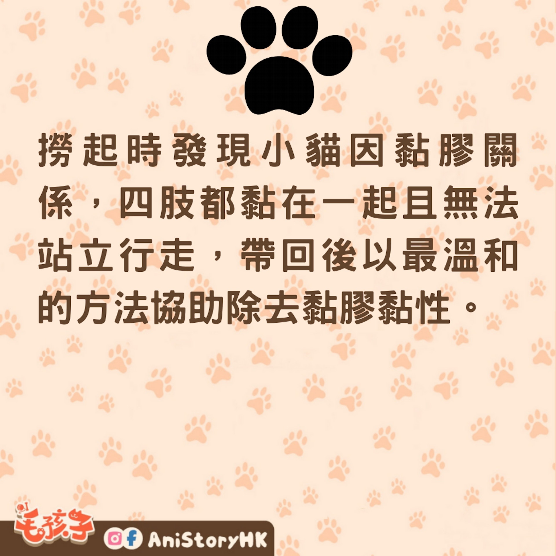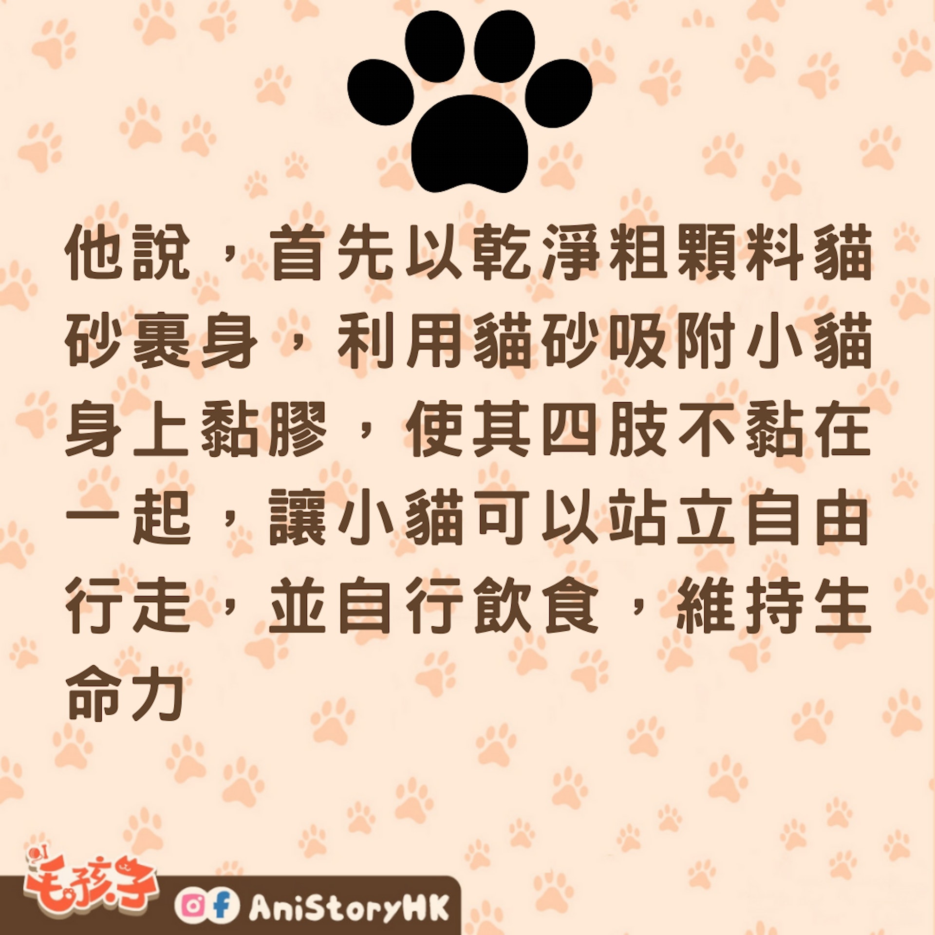 如何克服困難呢?他說,首先以乾淨粗顆料貓砂裹身,利用貓砂吸附小貓身上黏膠,使其四肢不黏在一起,讓小貓可以站立自由行走,並自行飲食,維持生命力,一周後再以細顆粒麵粉裹身,二次吸附黏膠,降低黏膠黏性。
