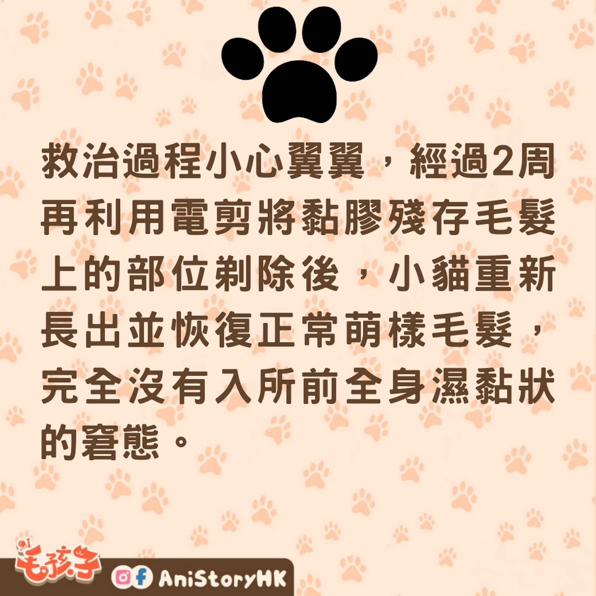 救治過程小心翼翼,經過2周再利用電剪將黏膠殘存毛髮上的部位剃除後,小貓重新長出並恢復正常萌樣毛髮,完全沒有入所前全身濕黏狀的窘態。