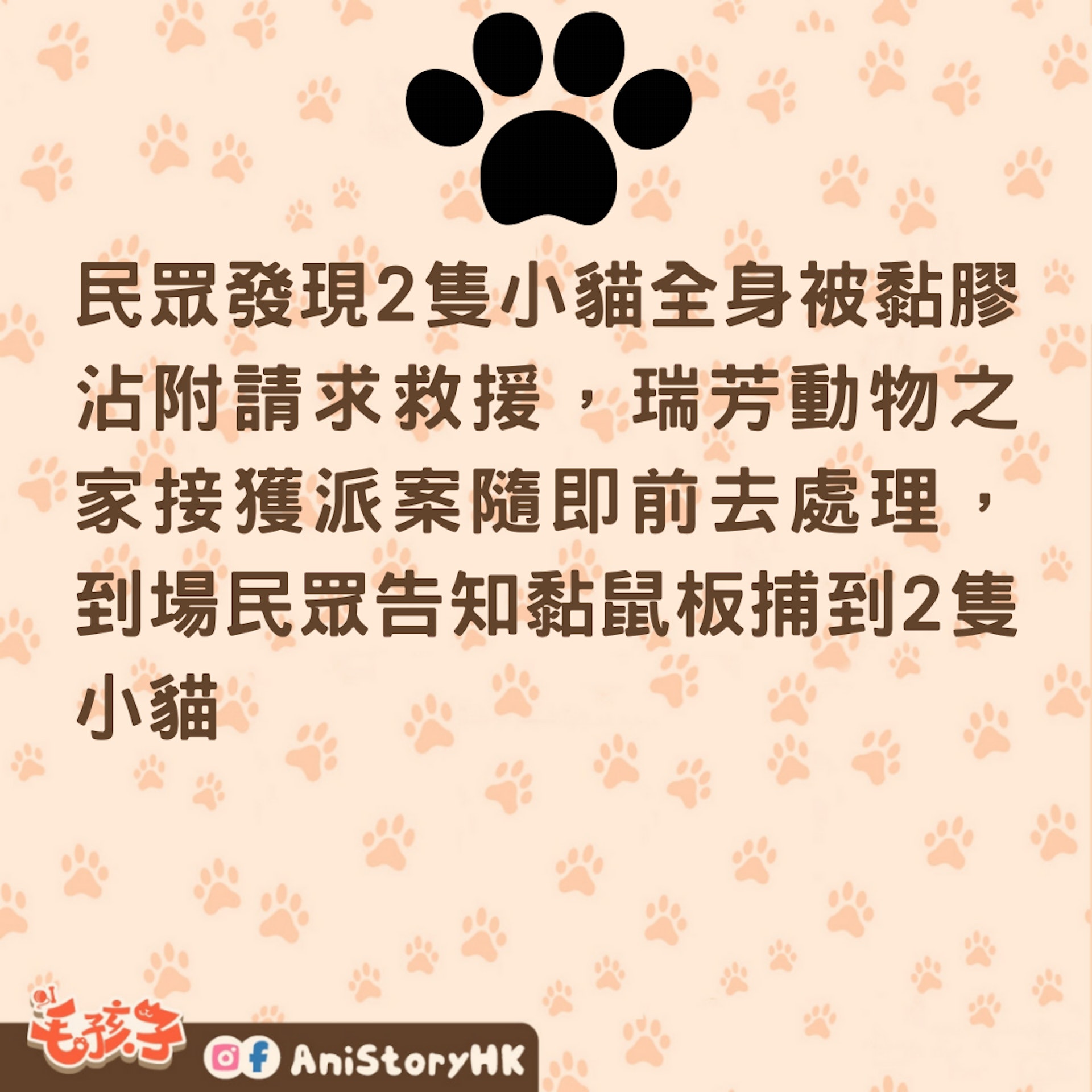 民眾發現2隻小貓全身被黏膠沾附請求救援,瑞芳動物之家接獲派案隨即前去處理,到場民眾告知黏鼠板捕到2隻小貓,他們已將貓隻分離並置於溫水中,希望能洗去黏膠,但效果不彰,反而使小貓四肢黏附在一起,更加難以行動與站立。