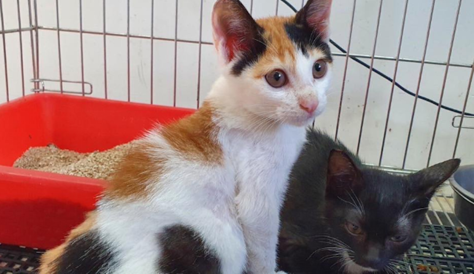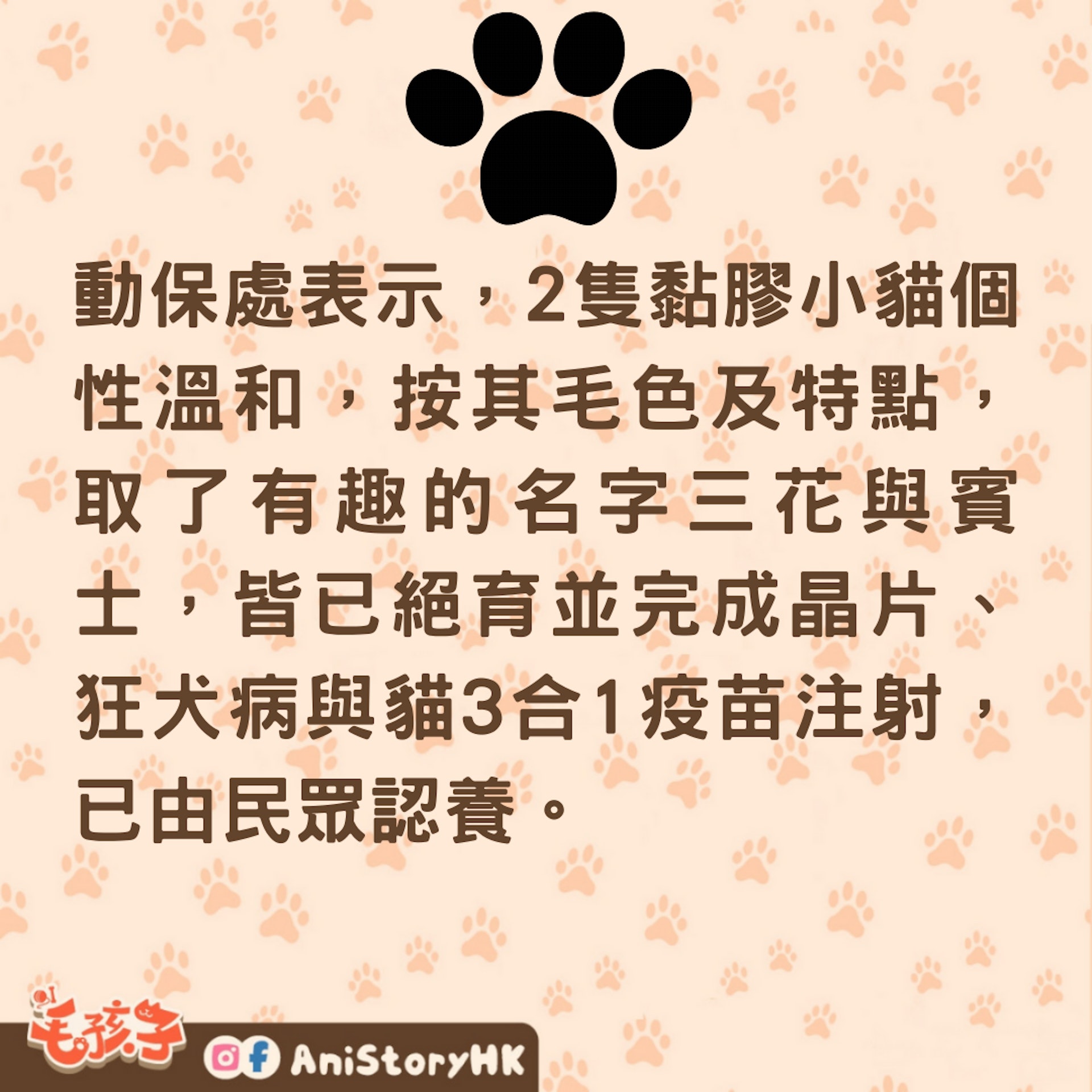 動保處表示,2隻黏膠小貓個性溫和,按其毛色及特點,取了有趣的名字三花與賓士,皆已絕育並完成晶片、狂犬病與貓3合1疫苗注射,已由民眾認養。