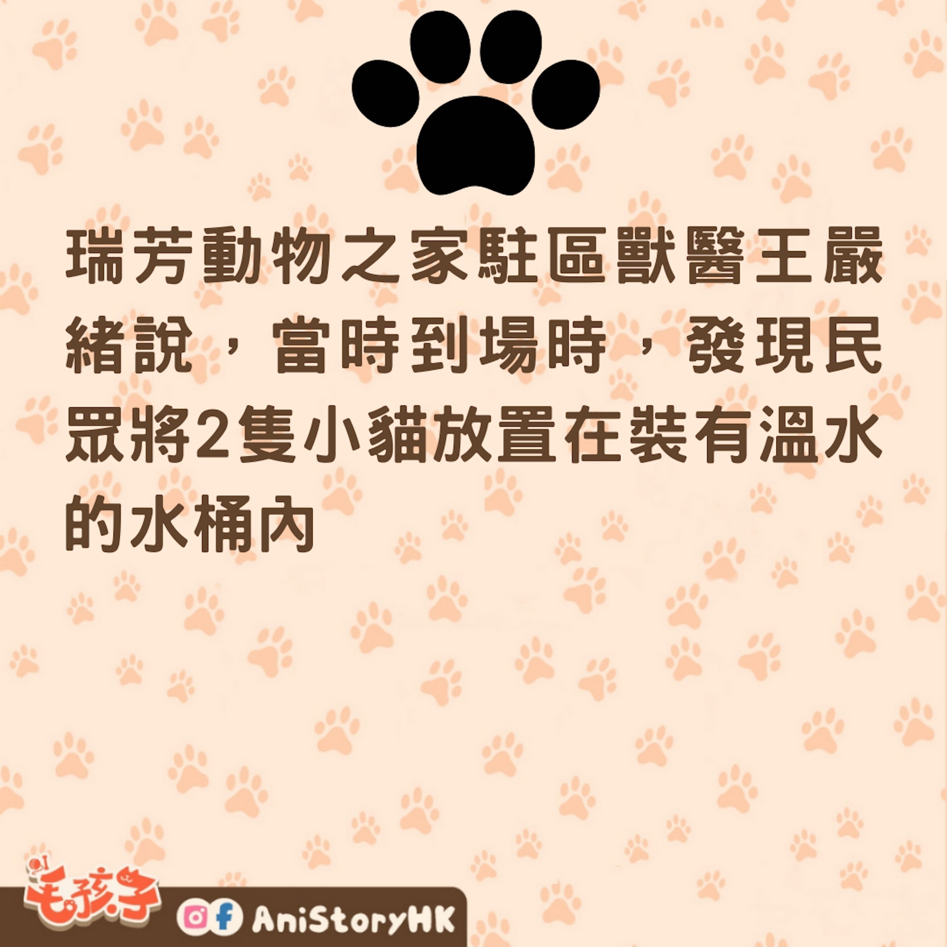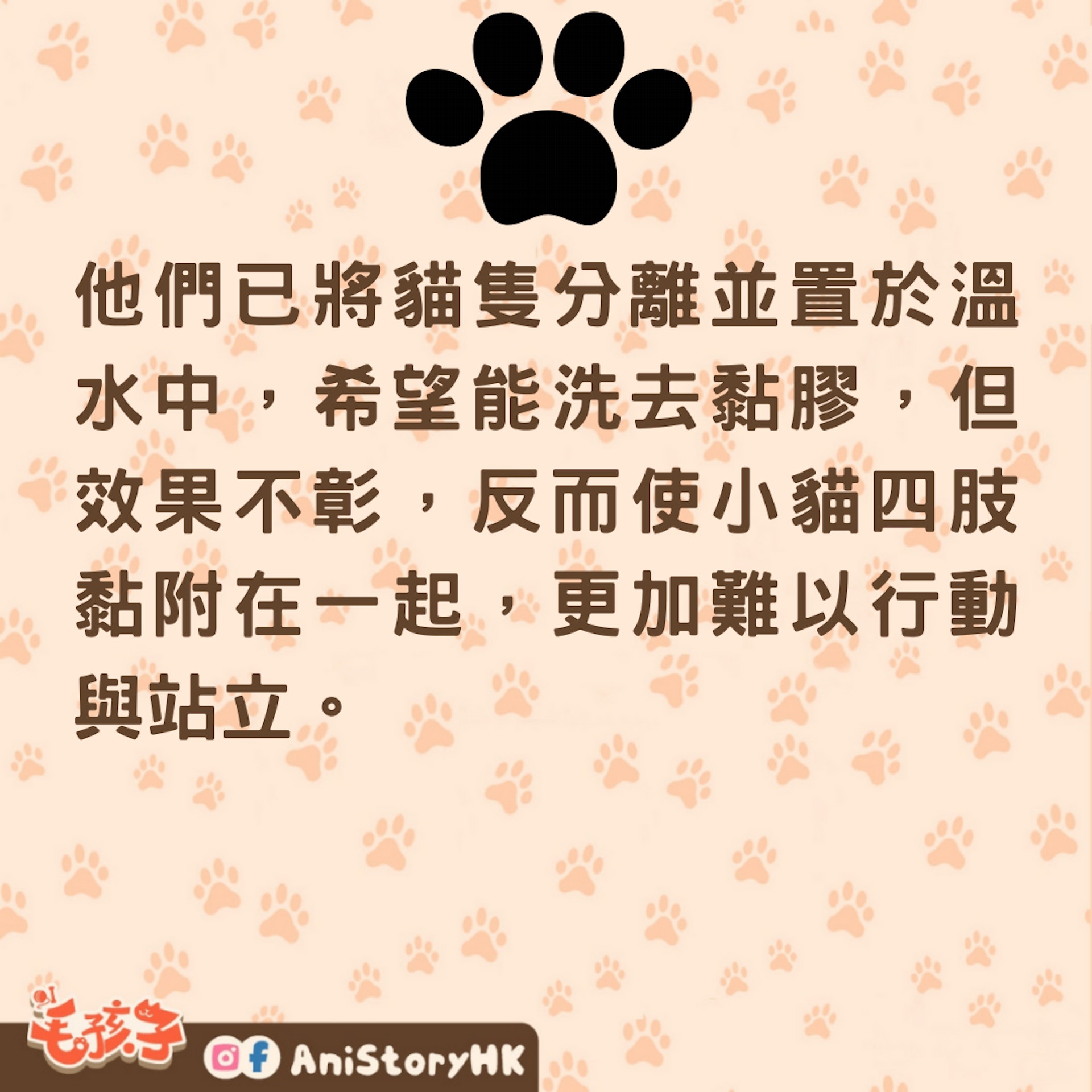 瑞芳動物之家駐區獸醫王嚴緖說,當時到場時,發現民眾將2隻小貓放置在裝有溫水的水桶內,撈起時發現小貓因黏膠關係,四肢都黏在一起且無法站立行走,帶回後以最溫和的方法協助除去黏膠黏性。