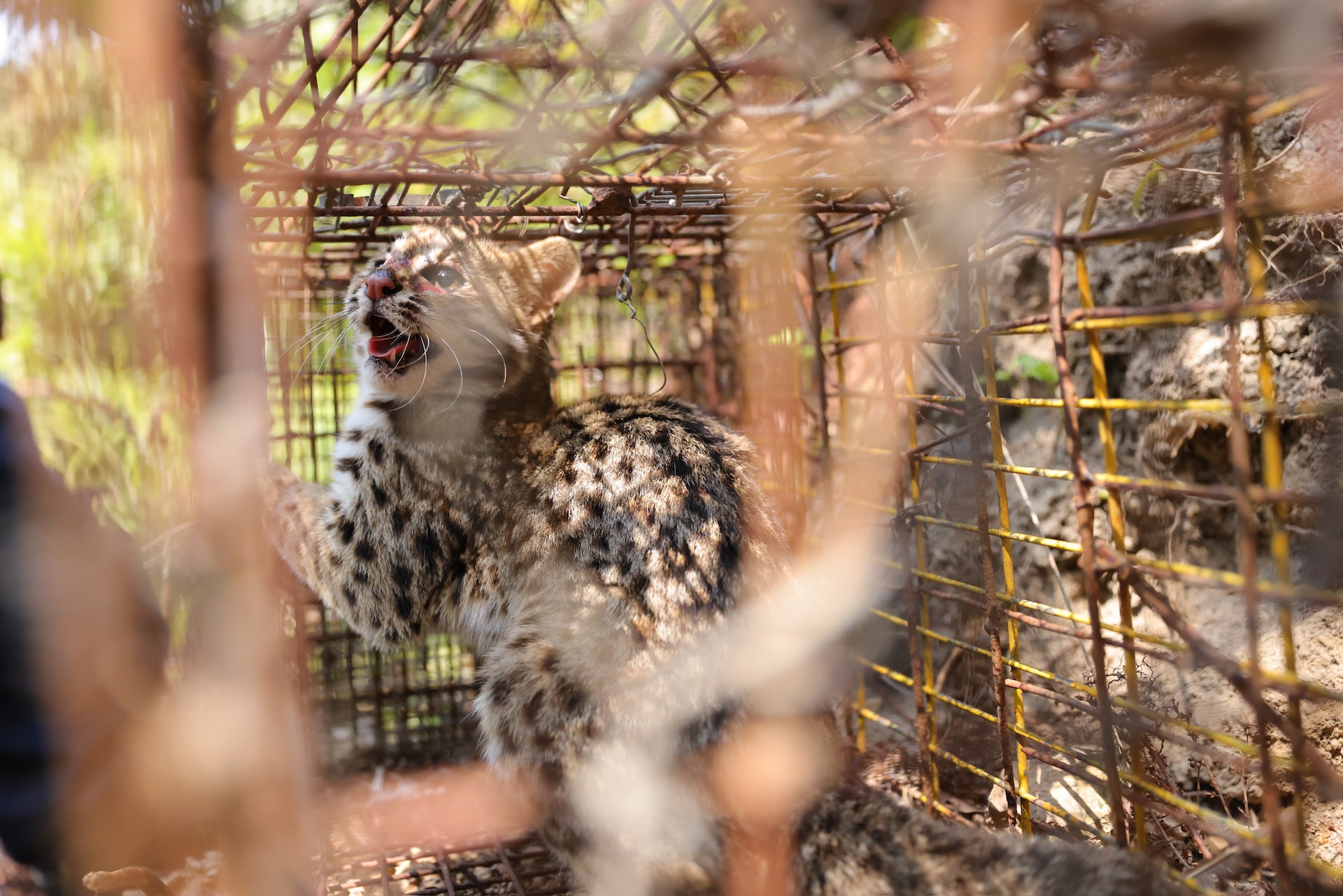 漁農自然護理署3月1日聯同愛護動物協會及相關部門於將軍澳寶林邨附近一山坡進行打擊非法使用狩獵器具的聯合行動,救出一頭被困捕獸籠內的豹貓。(漁護署圖片)
