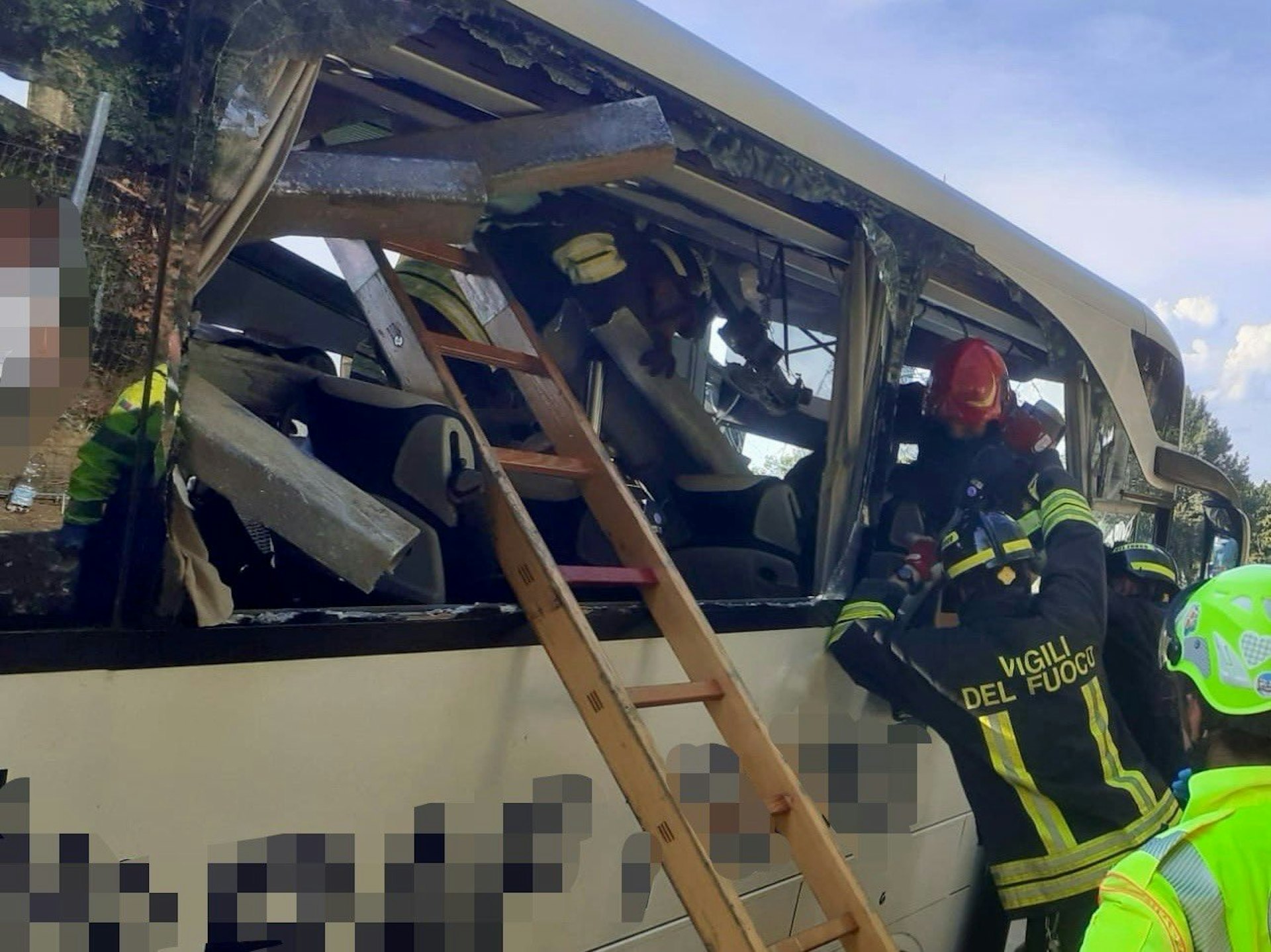 載有中國公民的旅遊巴8月4日在意大利阿雷佐附近發生交通事故。(X @vigilidelfuoco 圖片)公仔箱論壇& |2 s5 ]" `( a/ U( g' l