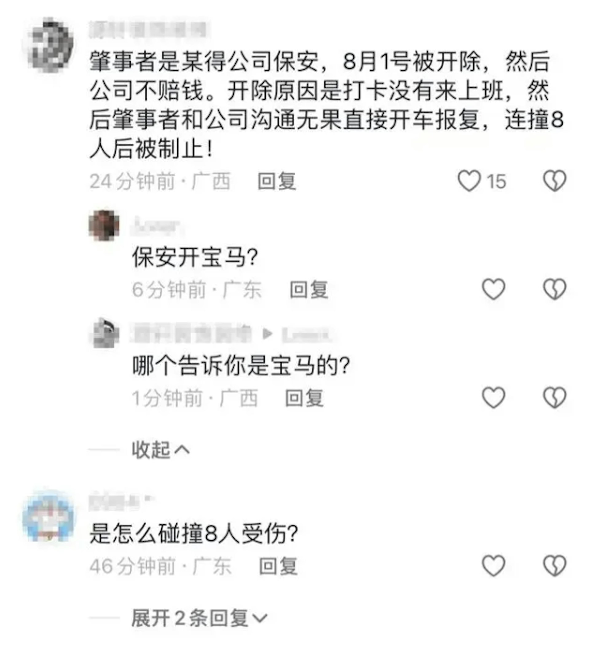* w6 [6 j) c3 U0 W$ z# `8 r: l5 \5.39.217.77有網友在社交平台相關影片下方留言稱,肇事者為「某得公司保安,起因是勞動糾紛產生的報復行為,肇事者連撞8人後被制止」。(《瀟湘晨報》)