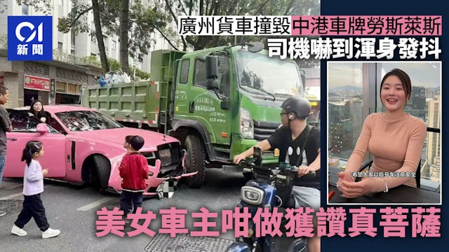 廣東省廣州的一輛貨車4日意外撞上一輛粉色的勞斯萊斯,導致後者的車頭被撞爛。