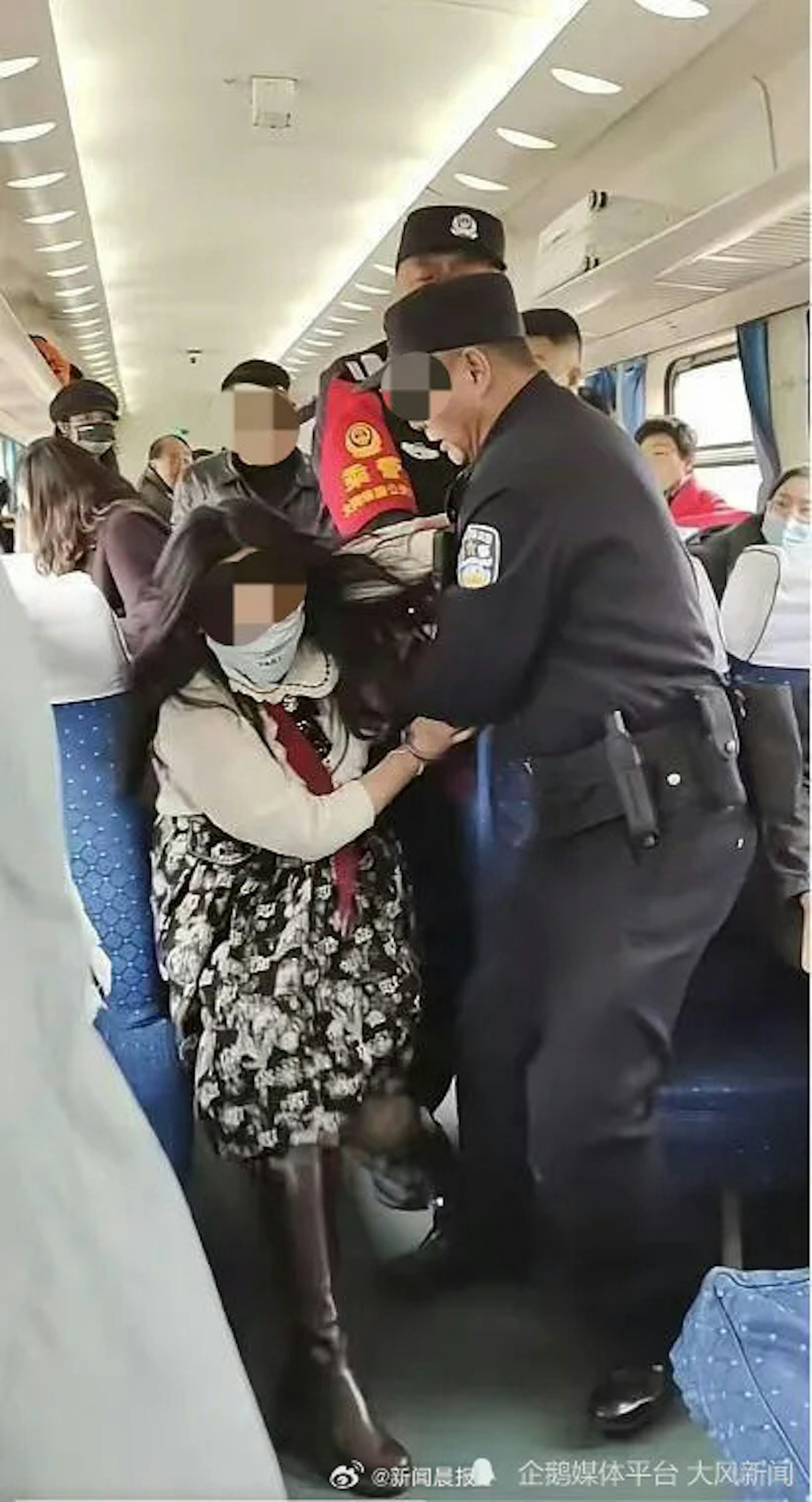 影片顯示,乘警正與女子交涉,但女子則大喊:「你等着,我死了,為我收屍!」隨即拿出剪刀,但被乘警快速奪下。其後女子大喊大叫,甚至對乘警動手,並用手機砸乘警,隨後被乘警強行帶走。