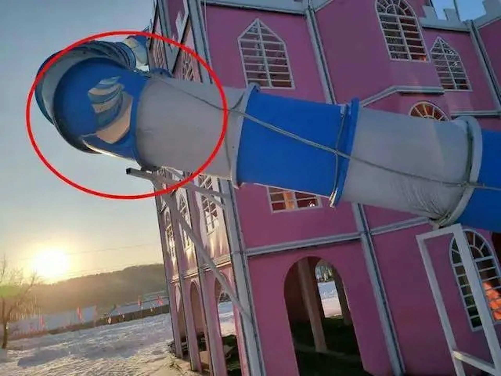 0 O4 ?+ w- B8 u公仔箱論壇《華商報大風新聞》報道,事發於吉林納美山谷旅遊度假區,粉色城堡連接多條密閉的管筒型滑梯,其中一條藍色滑梯的拐彎處側面出現破洞,滑梯破損處距離地面超過一個成年人的身高,位於粉色城堡二樓窗戶附近。