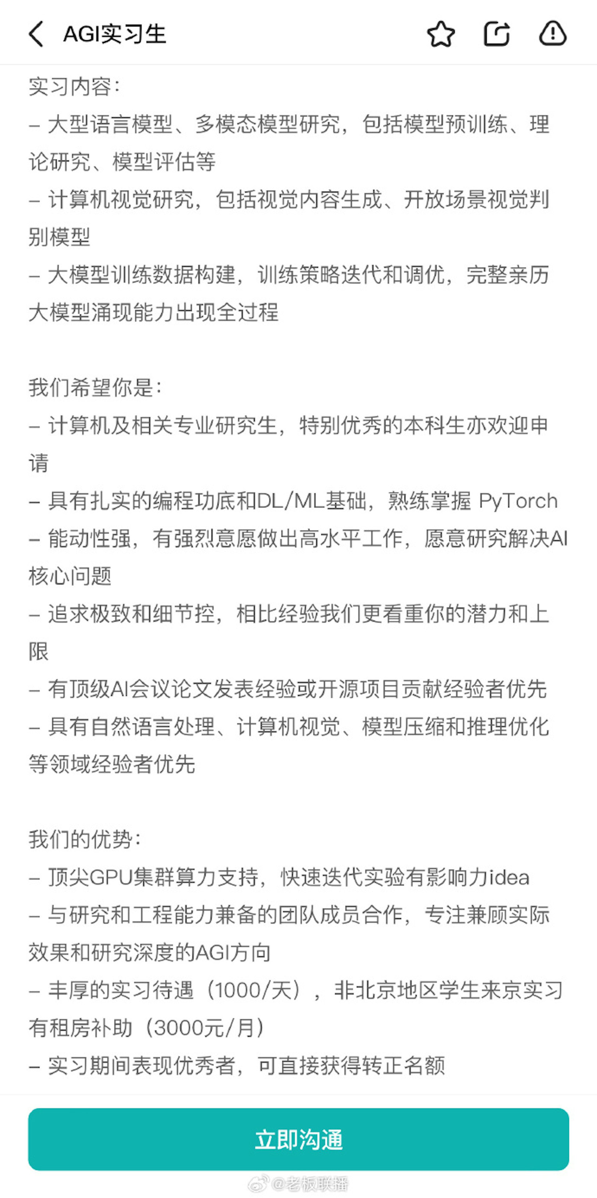 值得一提的是,該公司正在招聘實習生,AGI大模型實習生的工資為500元/天-1000元/天,數據百曉生實習生為500元/天-510元/天。 |