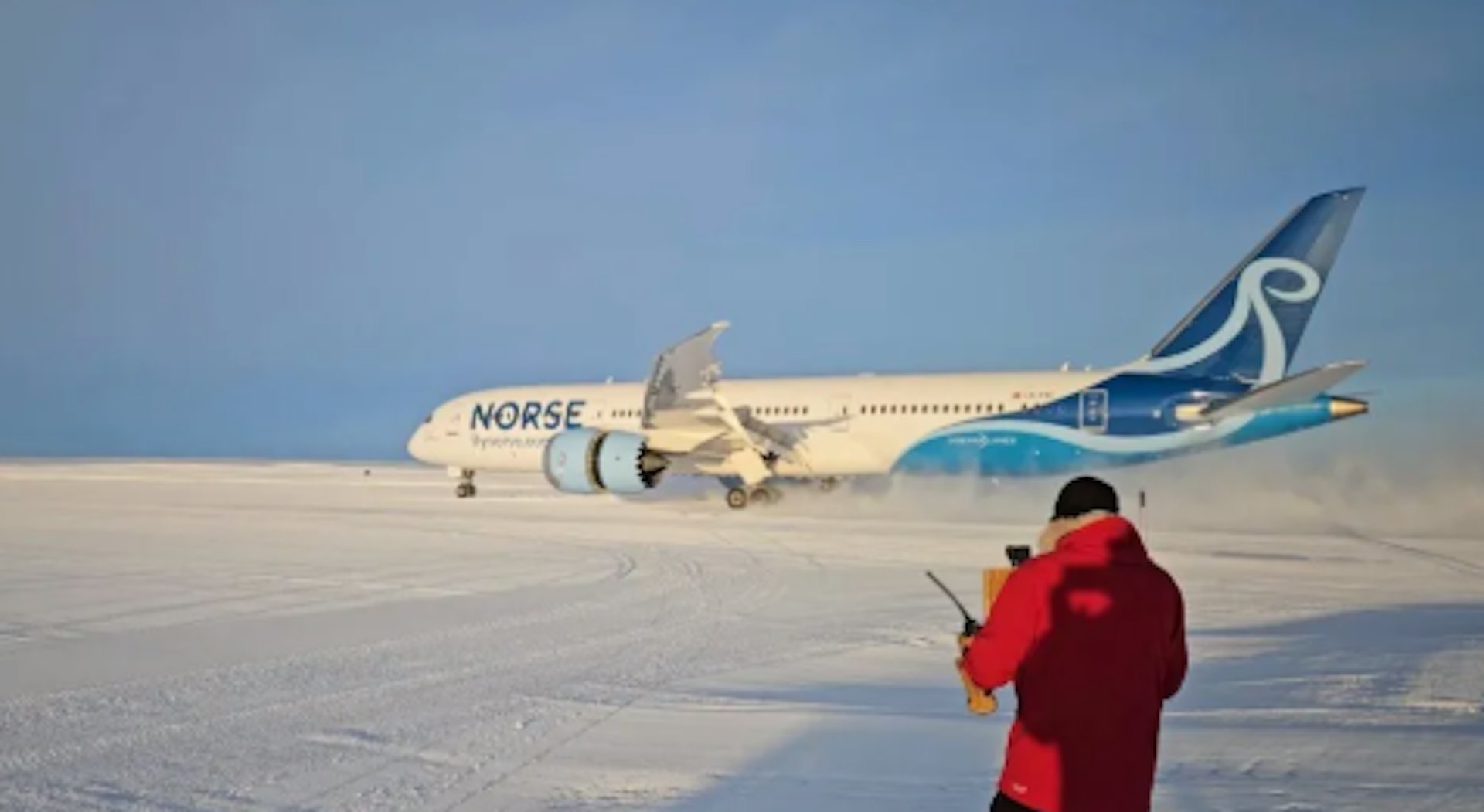 * T' G7 p) T$ G! x( w- A5.39.217.77波音787「夢幻客機」降落在南極由冰雪砌成的跑道上。(圖/翻攝自X@flightradar24)