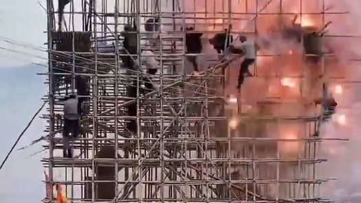 + u/ }, h3 Q4 ]+ K6 ?4 CTVBNOW 含有熱門話題,最新最快電視,軟體,遊戲,電影,動漫及日常生活及興趣交流等資訊。影片顯示,多名村民站在用竹搭建的數米「炮台」上,一名村民點燃爆竹後,不慎引燃高台上其他的爆竹。大量爆竹瞬間炸響,高台上多人來不及躲閃,踉踉蹌蹌爬走,其中一人疑失足從高處墮下,有村民疑被灼傷,不停在泥水中打滾。