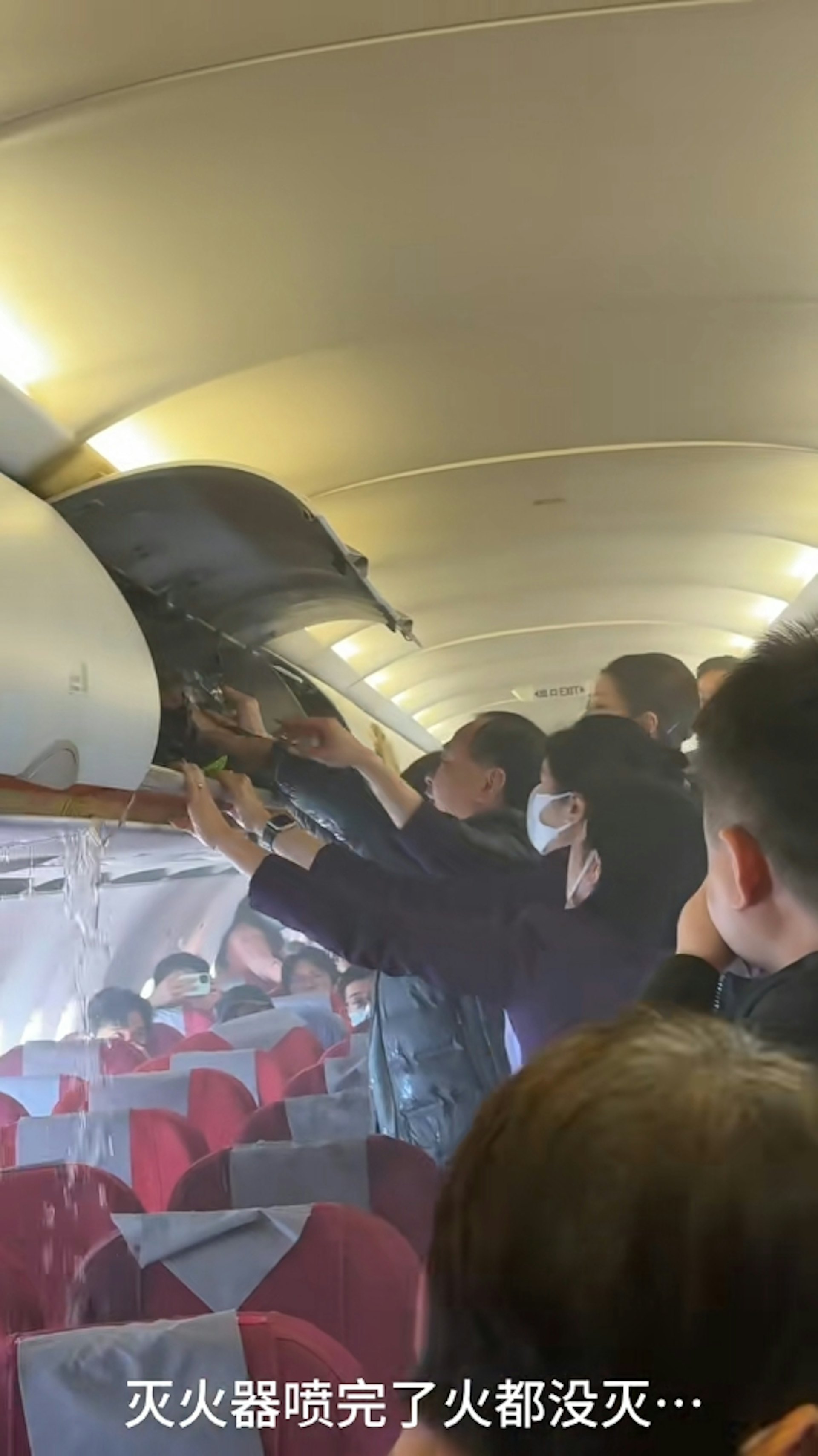 , q5 ^- t/ v! W* @! k ntvb now,tvbnow,bttvb圖為充電寶起火後,乘客及空姐不斷向行李架倒水滅火。(影片截圖)