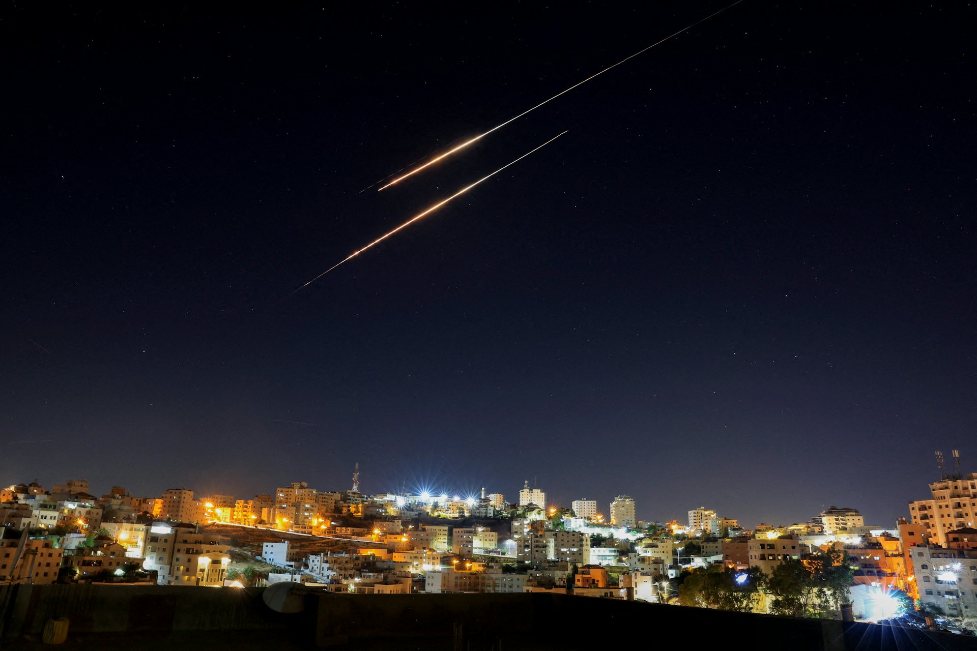 7 q/ W! w4 W& Etvb now,tvbnow,bttvb2025年6月19日,圖為以色列佔領的約旦河西岸一個定居點上空,可見伊朗向以色列境內發射的導彈略過星空。(Reuters)