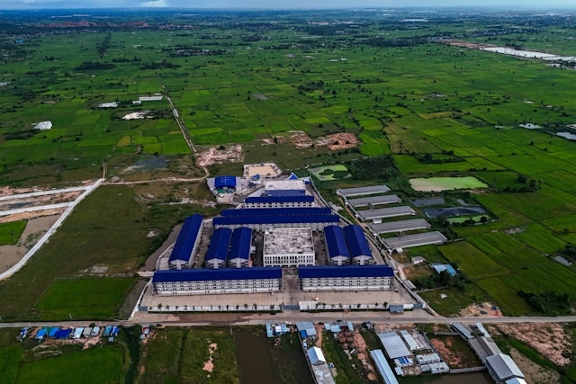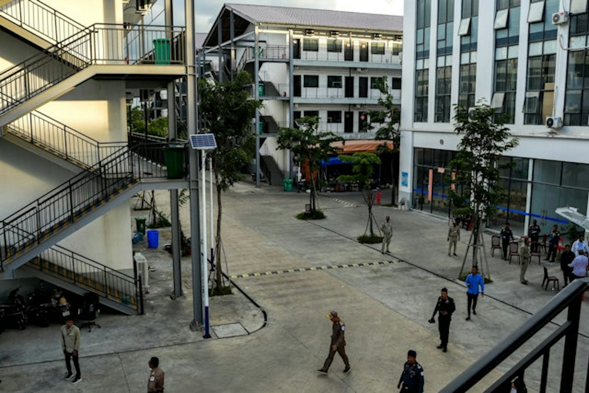 2025年10月16日,無人機拍攝了柬埔寨茶膠省詐騙園的一處建築。(Reuters); b4 M( H* }0 M4 A& E