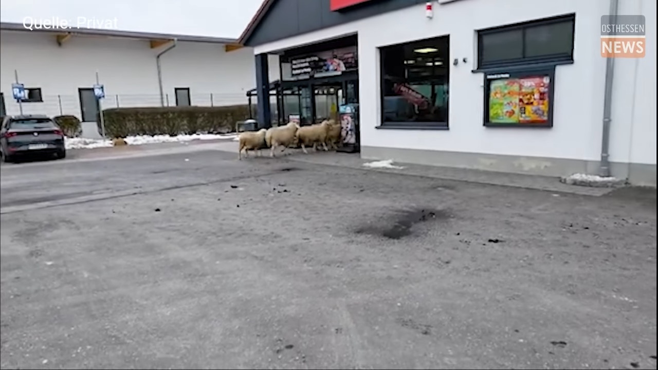 德國巴伐利亞當地一間超市發生離奇事件,突然有50隻羊闖進超市中,把超市擠得水泄不通。(截取自YouTube@osthessen-newsde)