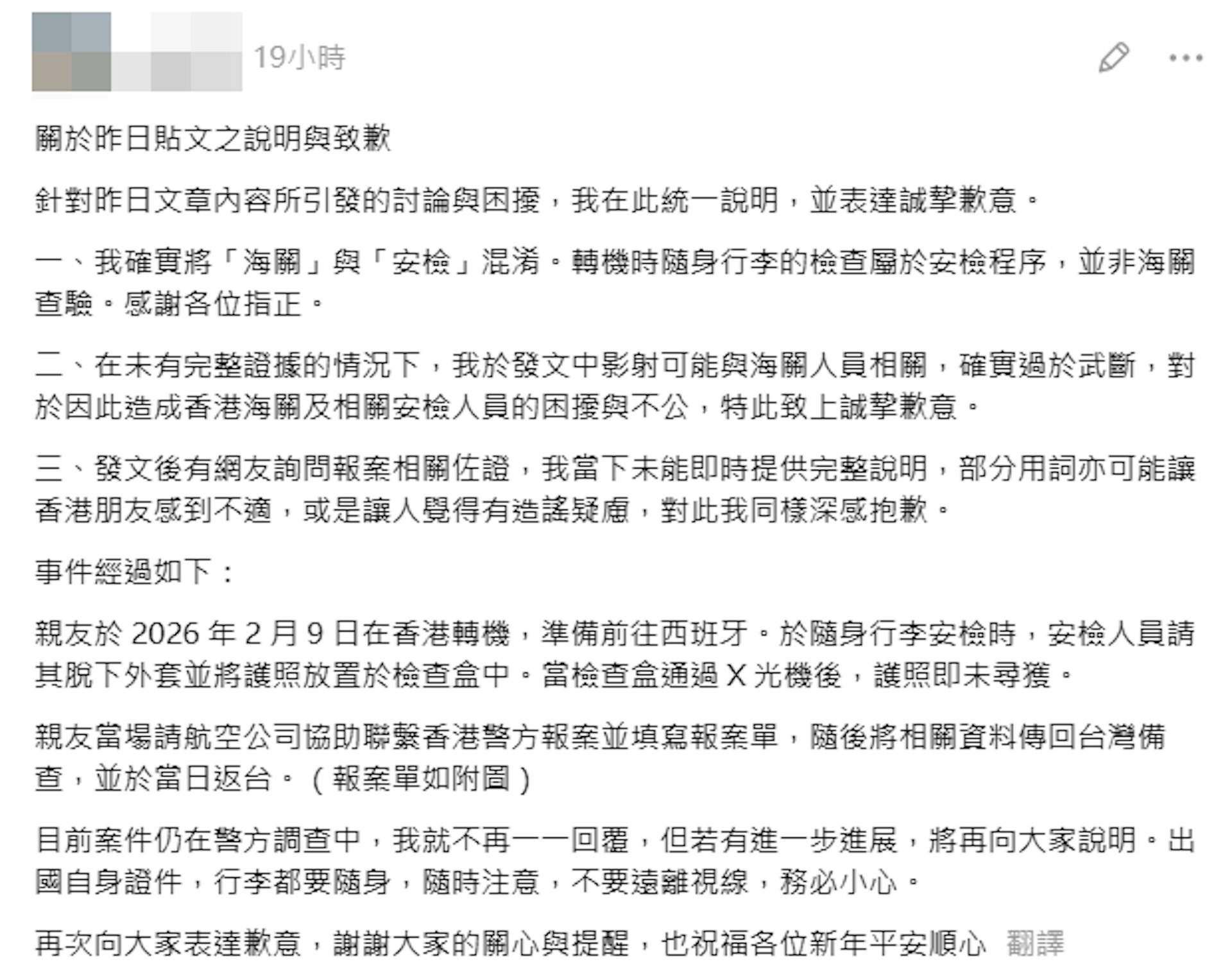 她並再次說明事件經過:「親友於2026年2月9日在香港轉機,準備前往西班牙。於隨身行李安檢時,安檢人員請其脫下外套並將護照放置於檢查盒中。當檢查盒通過X光機後,護照即未尋獲。親友當場請航空公司協助聯繫香港警方報案並填寫報案單,隨後將相關資料傳回台灣備查,並於當日返台......目前案件仍在警方調查中,我就不再一一回覆。」