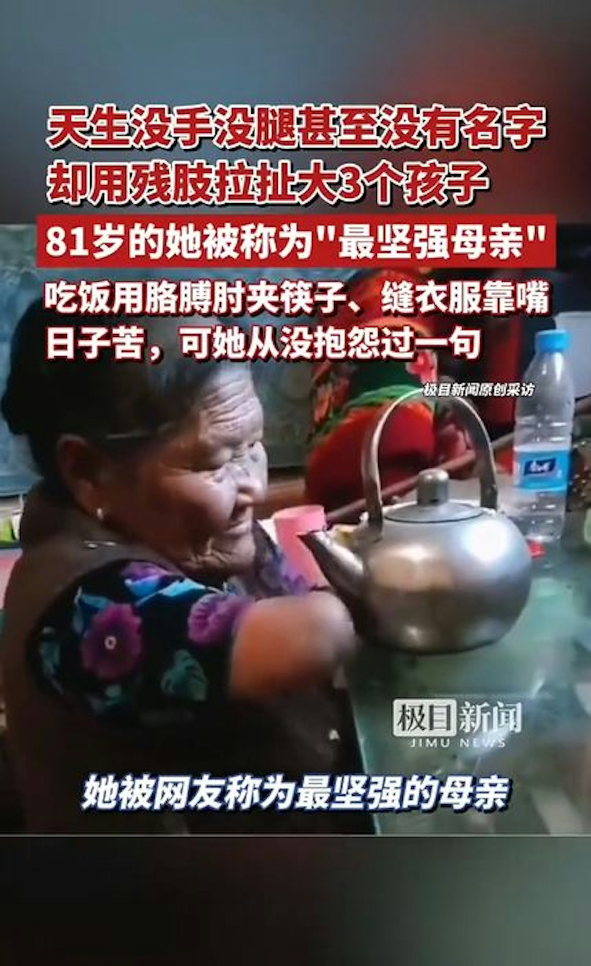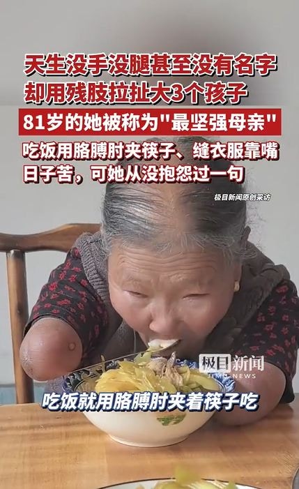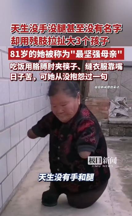 內地甘肅省白銀縣的81歲婦人王玉氏先天四肢不全,卻憑著自己堅韌的力量撫養3個子女長大。(微博@極目新聞)