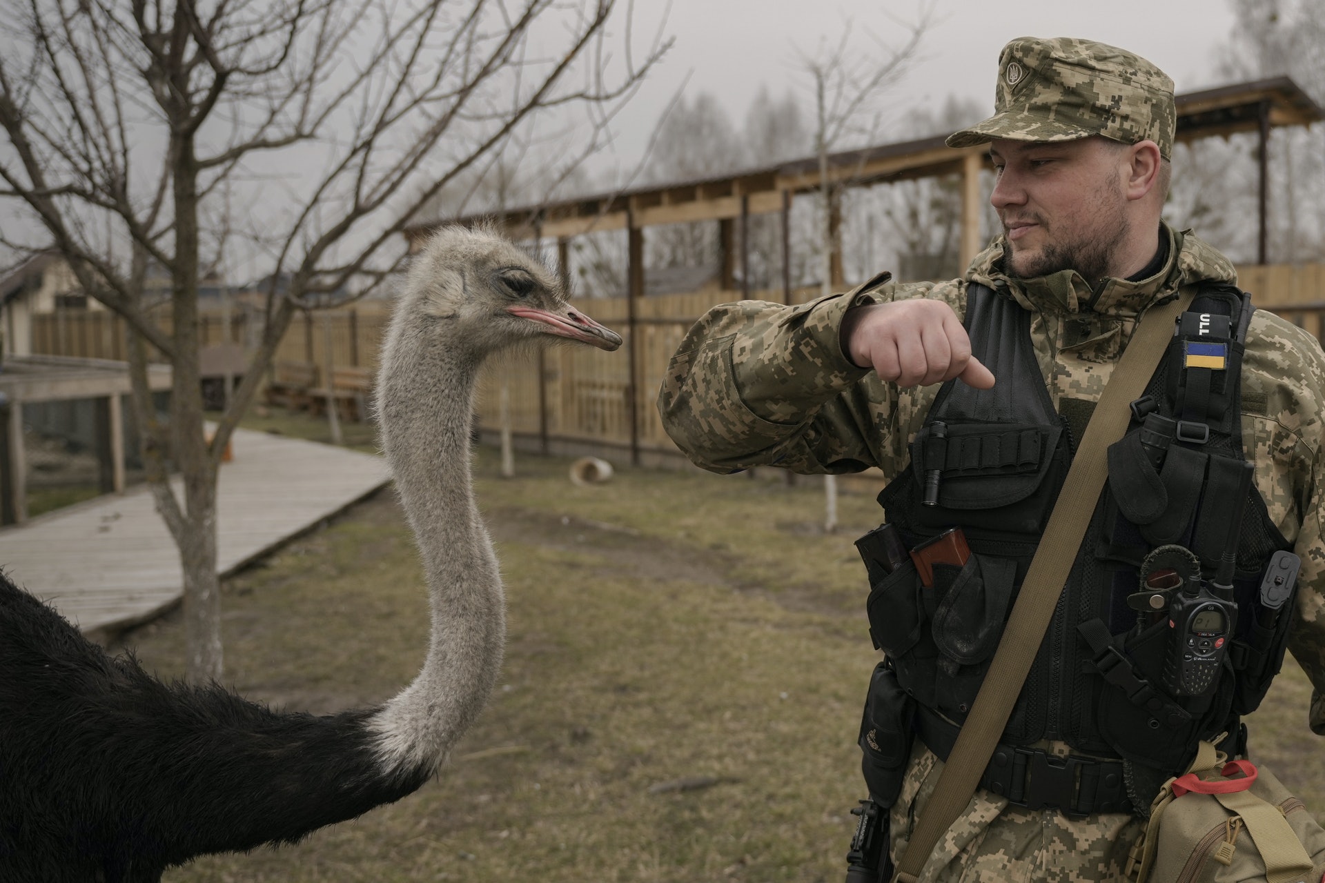 烏克蘭軍人在短暫守護着動物園內的鴕鳥。(Vadim Ghirda/美聯社)