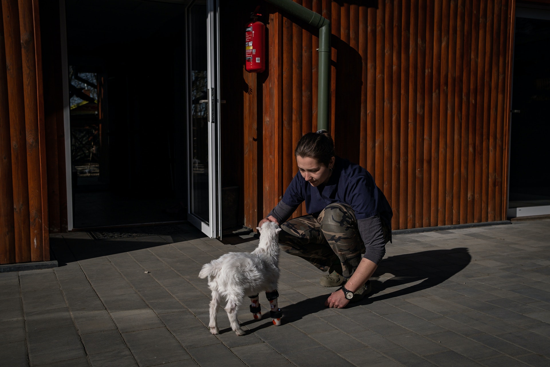 ADA基金會始創人之一Radek 在救治一頭在烏克蘭農場尋到的小山羊。(視覺中國)