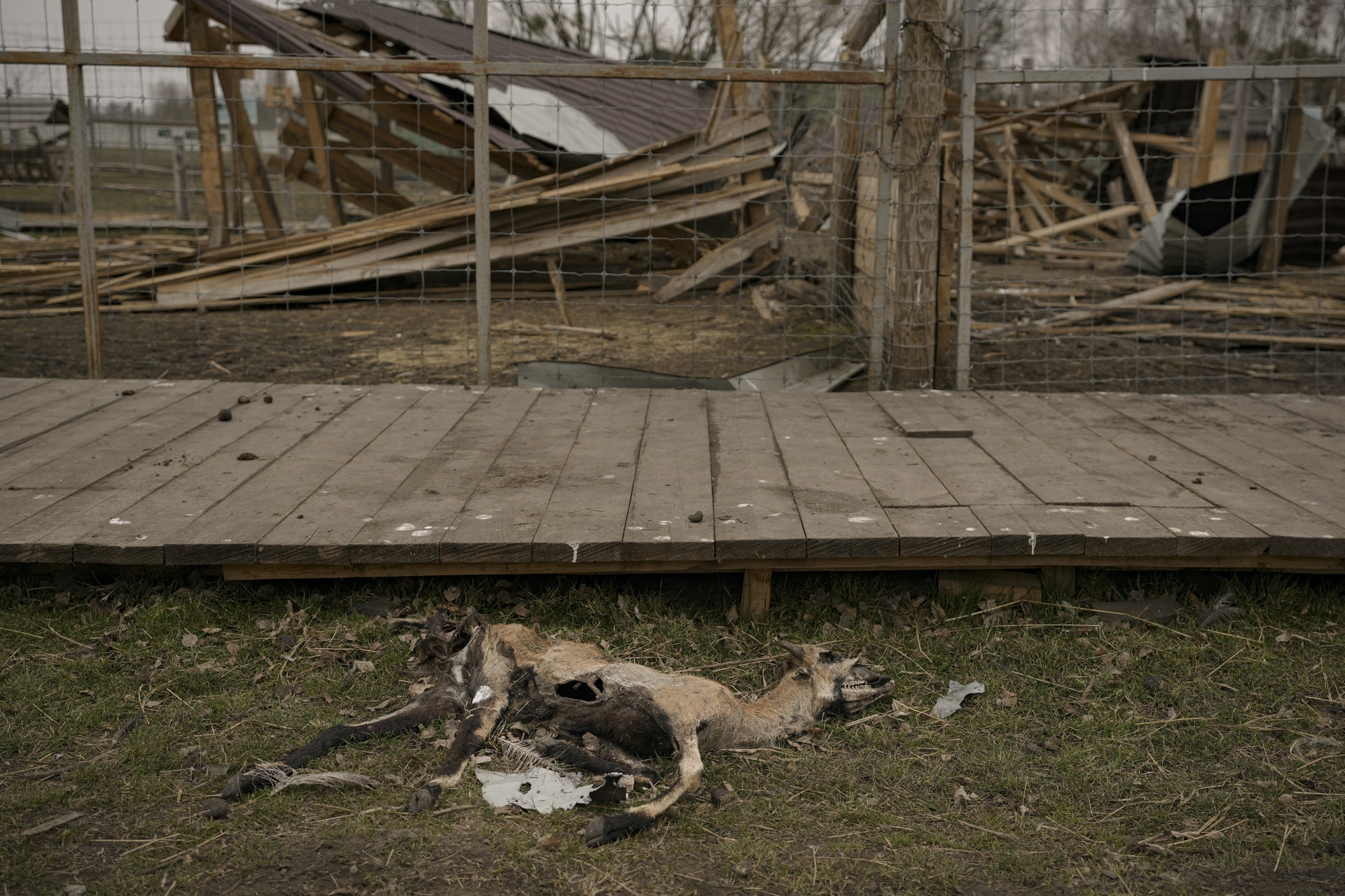 一隻山羊在受轟嚴重的私人動物園內死去。(Vadim Ghirda/美聯社)