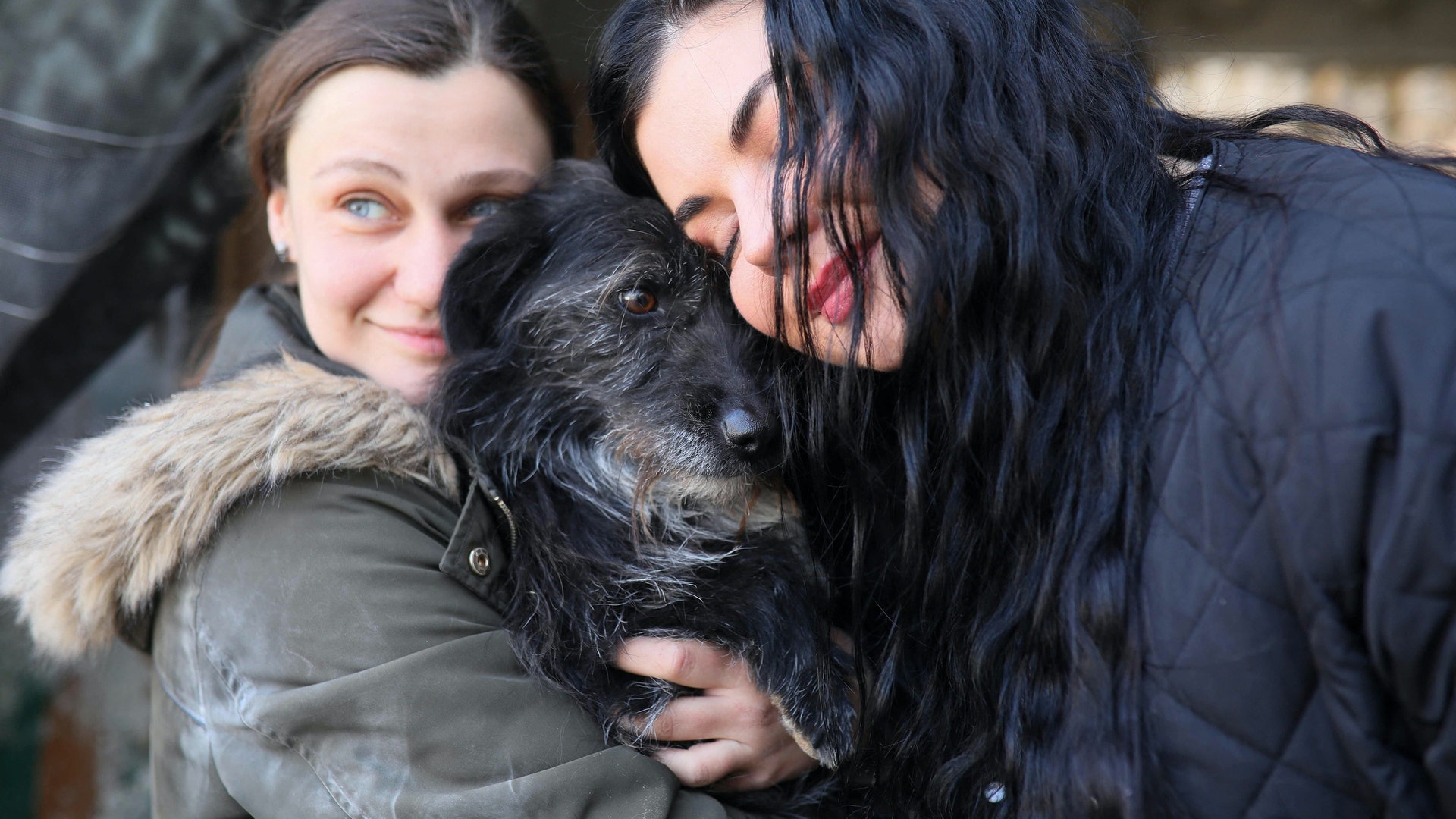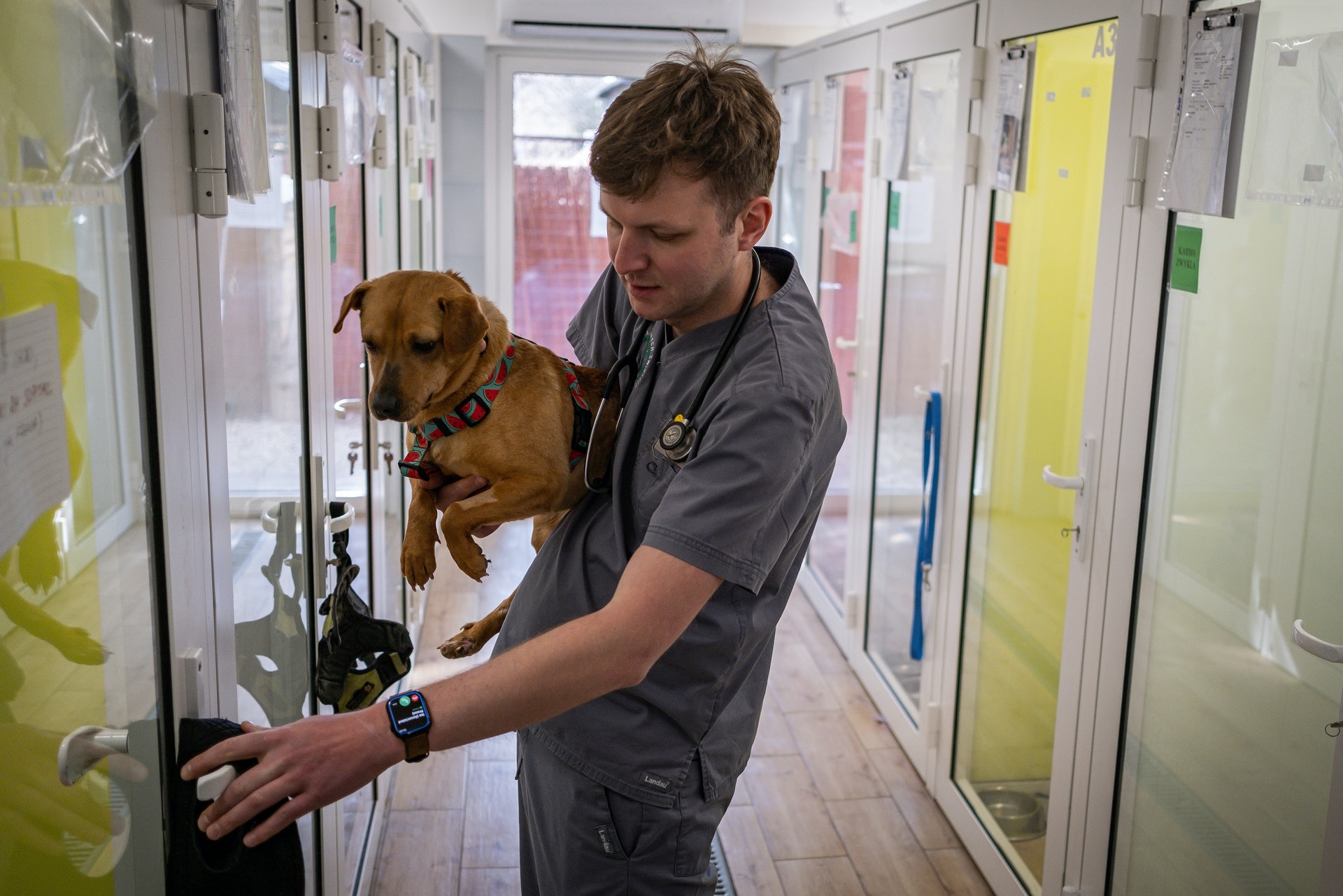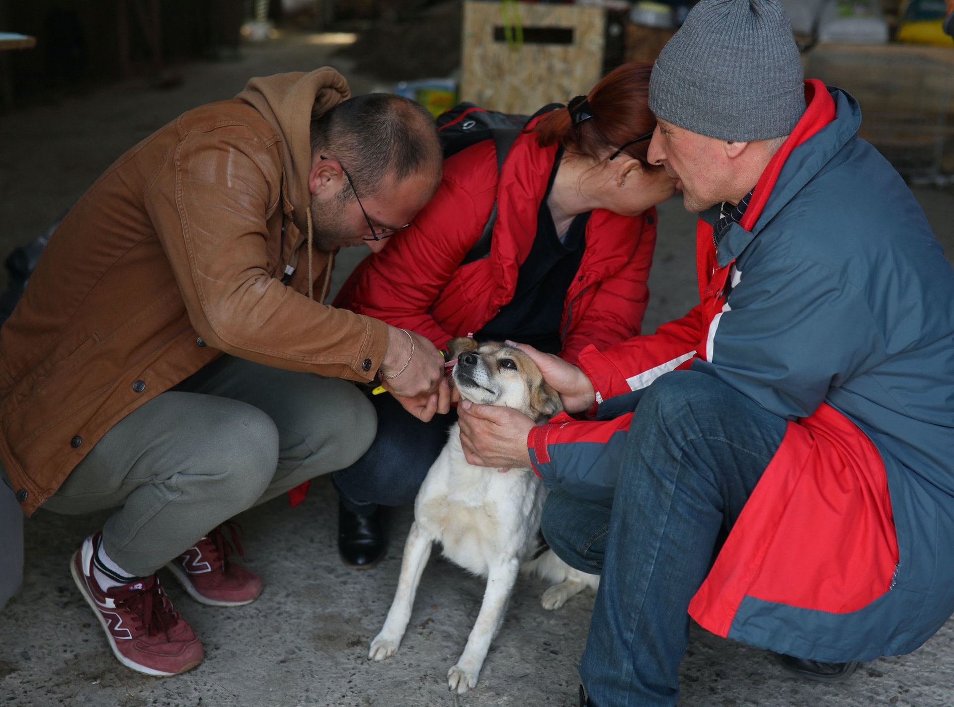 在利沃夫,「Home for Rescued Animals」收容所經理Orest Zalypsky (左)在送走狗隻予領養家庭前,將牠身上的標籤拆下。(視覺中國)