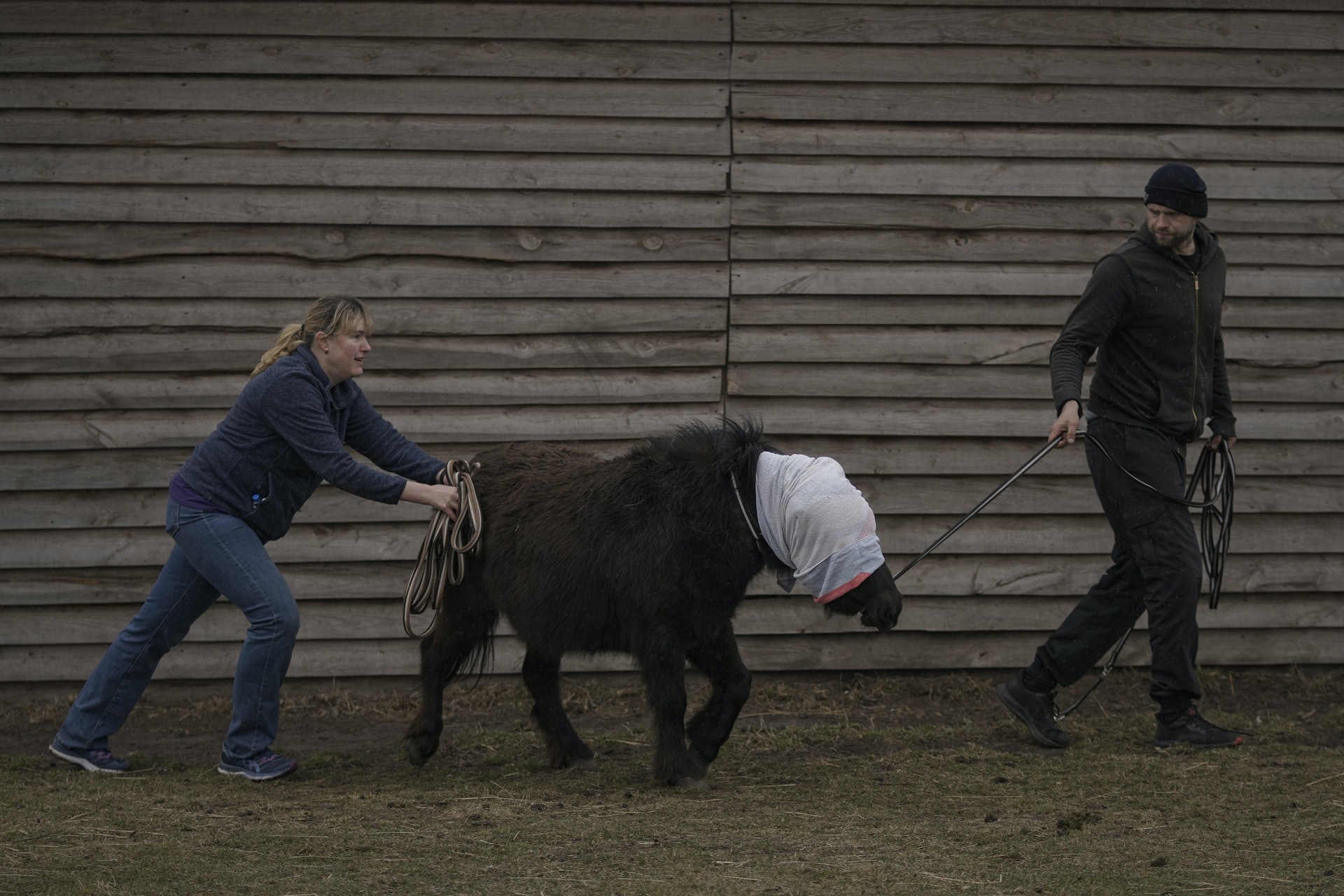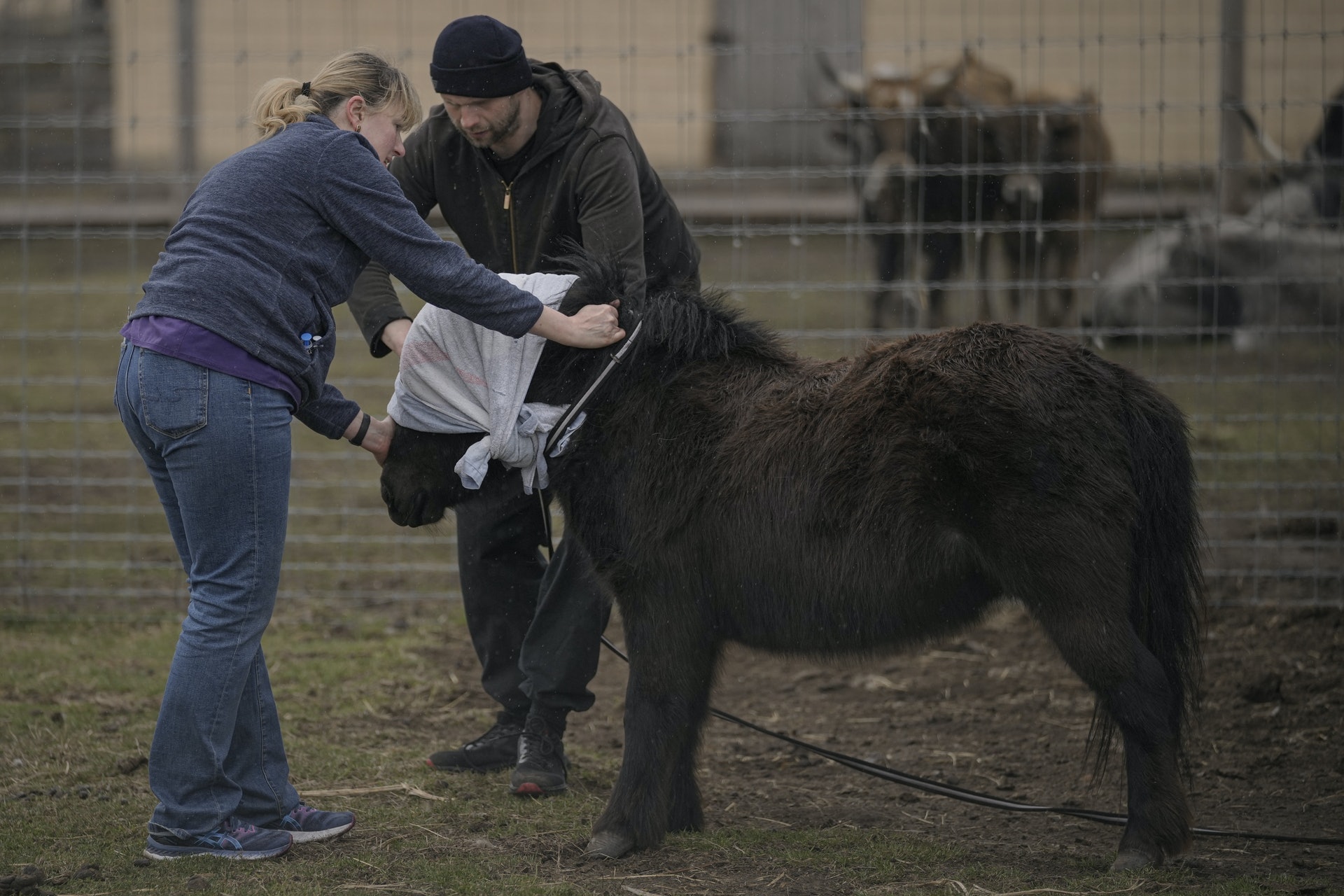 回到基輔近郊,義工用布掩蓋一頭小型馬的視野,減少牠承受的外在刺激及壓力,準備帶走牠撤離動物園。(Vadim Ghirda/美聯社)
