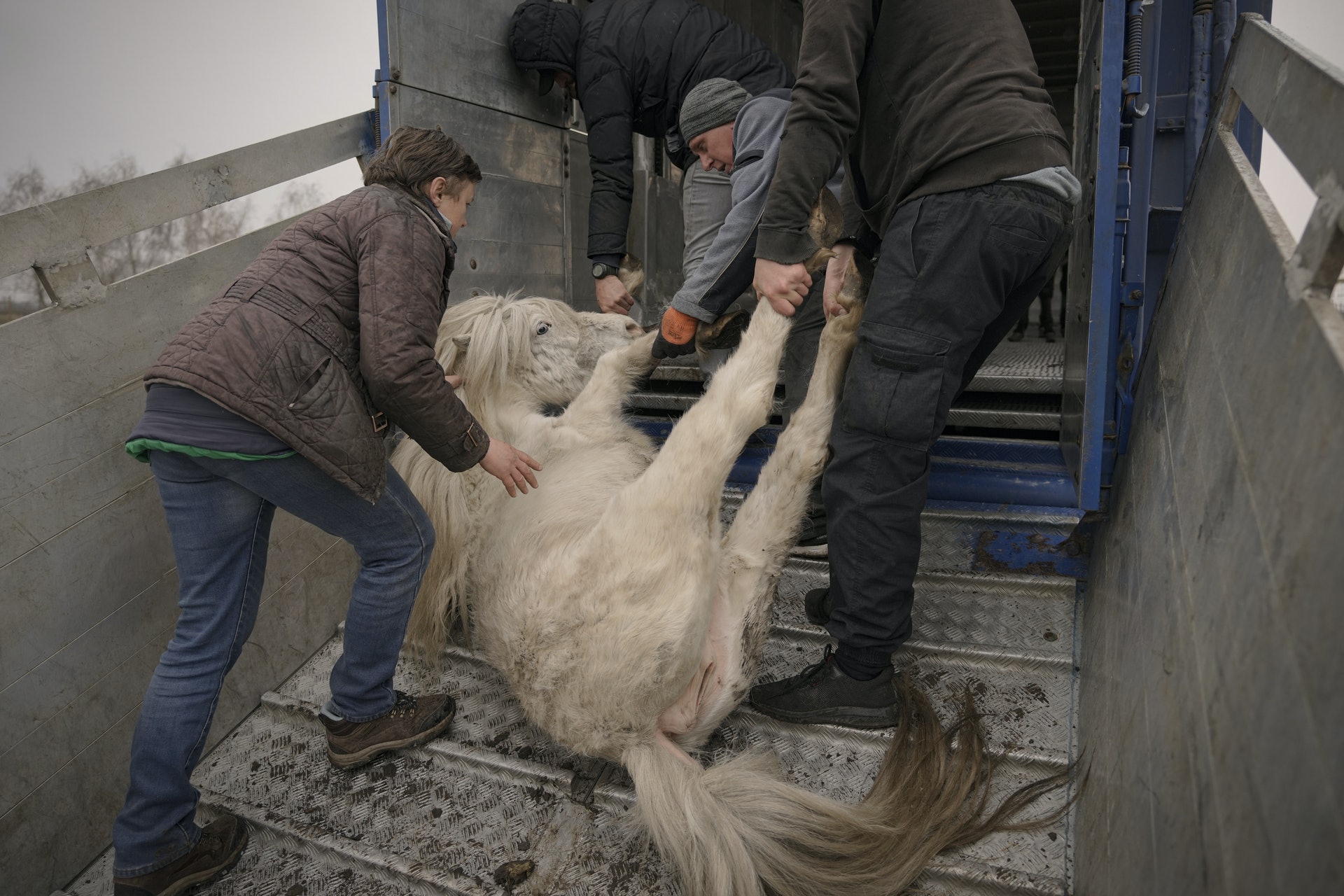義工們將另一頭未被蒙眼而嚇壞了的小型馬抬上貨車,準備送它到安全地方。(Vadim Ghirda/美聯社)