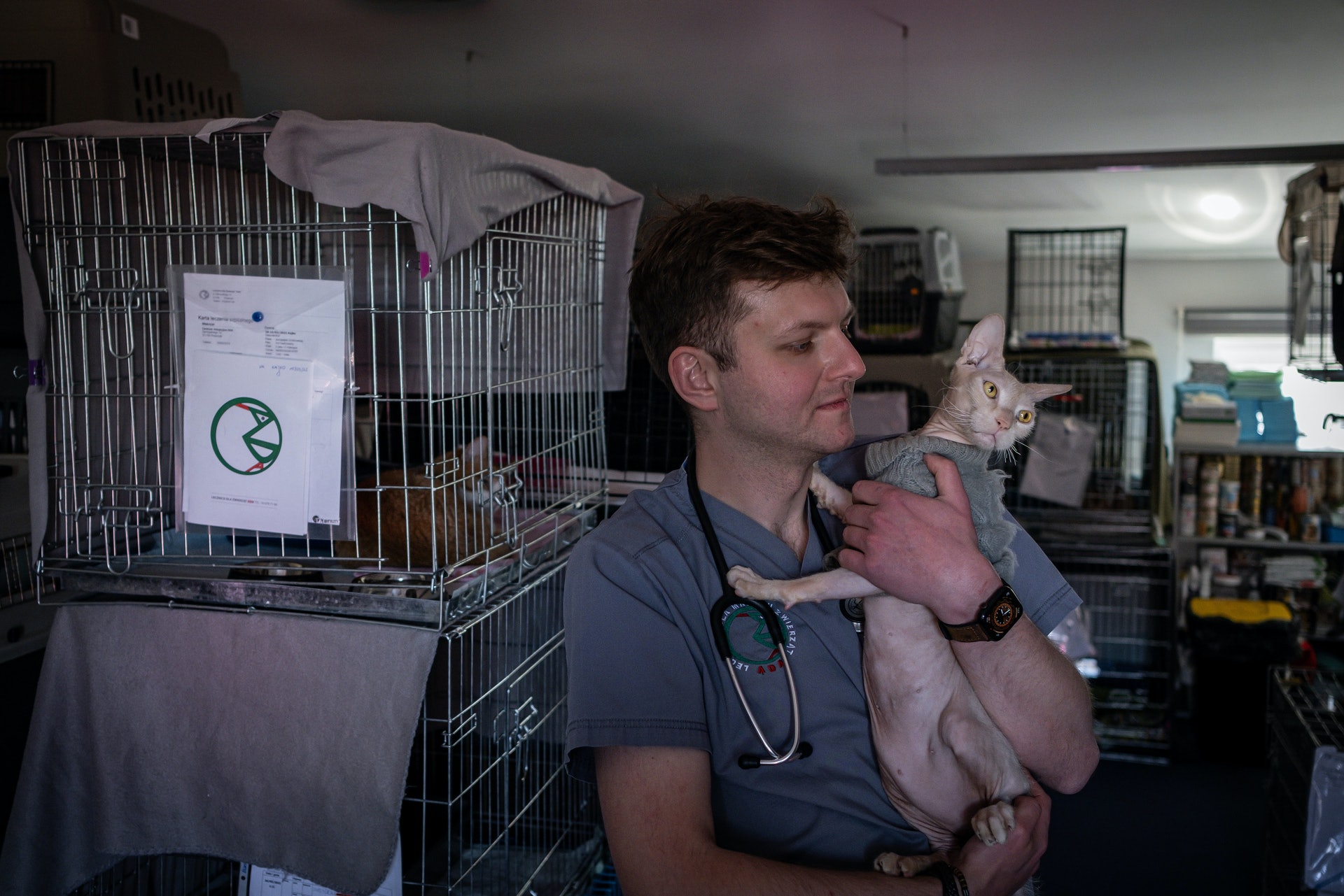 另一位基金會始創人Jakub Kotowicz 懷抱着他救治的斯芬克斯貓。(視覺中國)
