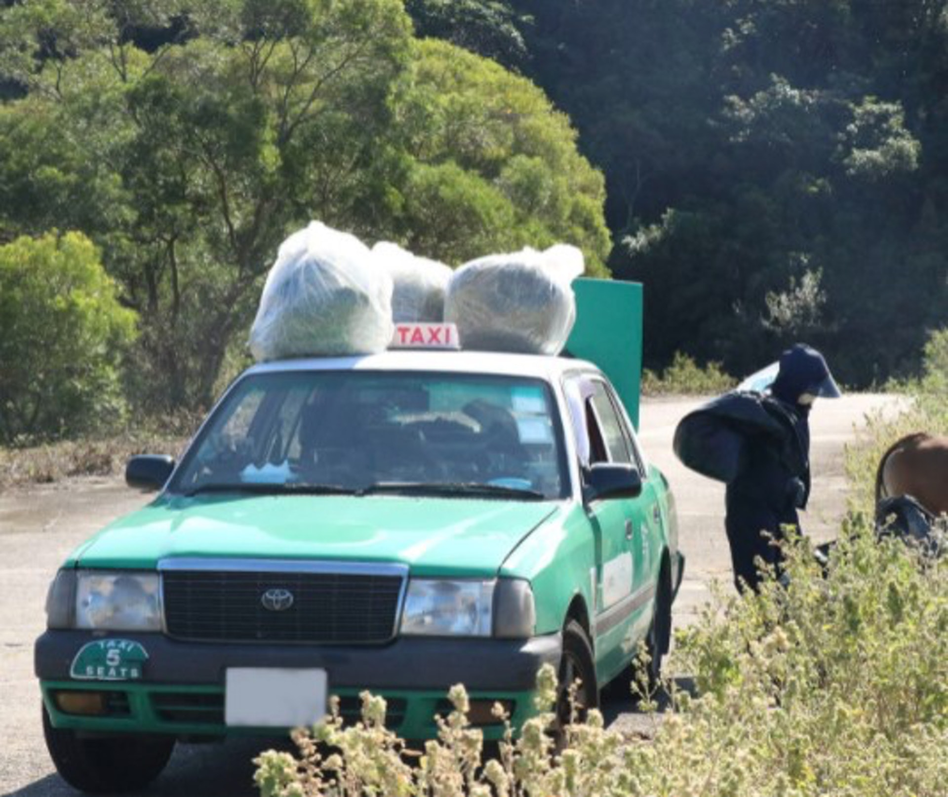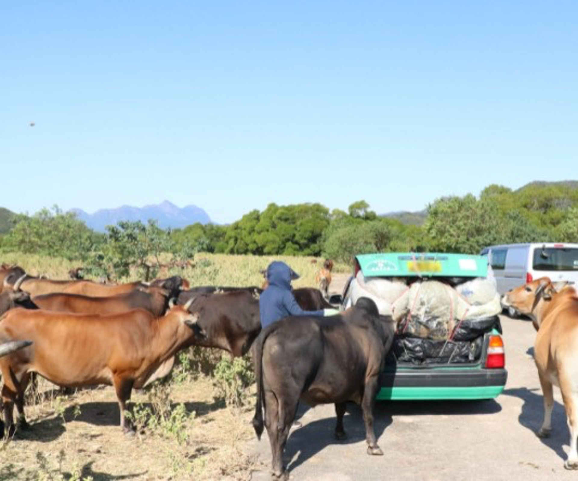 早上10時的創興烈日當空,西貢十四鄉村牛關注組負責人Fanny穿著長袖衣、戴上防曬帽,匆匆向記者打過招呼後,就隻身走向50多隻黃牛,開始派草。來回十多趟,Fanny從的士尾箱拿出一板又一板乾草,放在黃牛群身旁。牛隻沒有一窩蜂湧往草堆,而是有序地進食。
