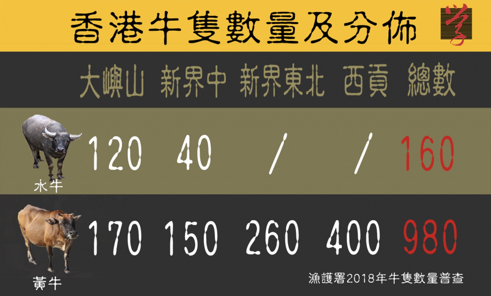 水牛和市民平日郊遊常見的黃牛一樣,本是香港稻米農夫的耕牛,70年代起因農業式微而遭遺棄。相比黃牛短直的角,水牛的角粗大彎曲,像把橫放的鐮刀。水牛的數量亦較少,現時全港約有160隻,其中120隻棲息在大嶼山。