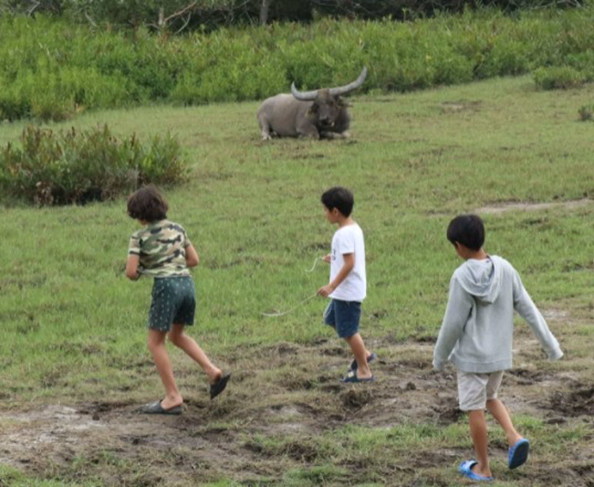 數名兒童在水牛前方草地玩耍(李楚倩攝/大學線授權使用)