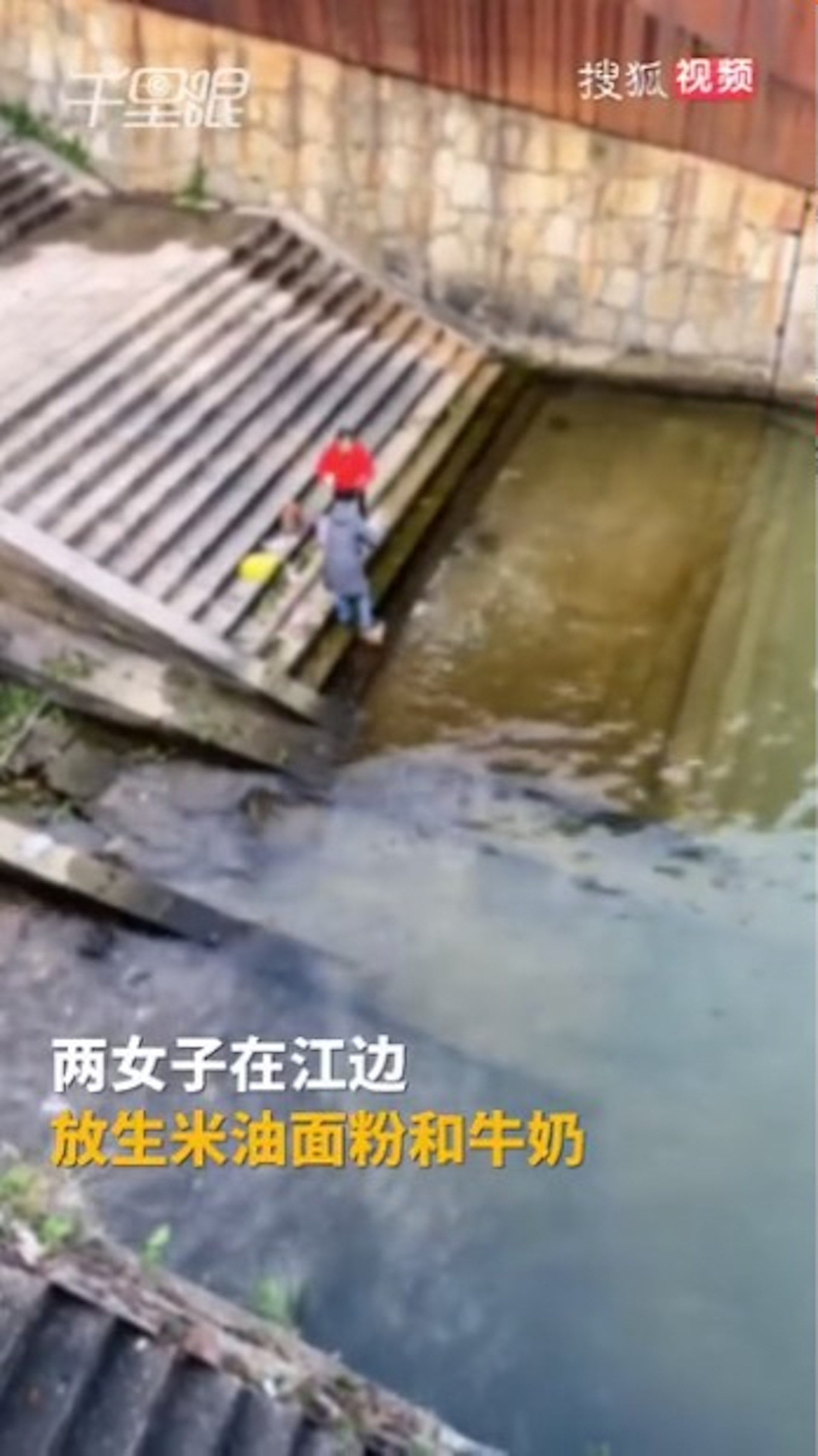 7 F1 c- v3 }2 C( H" [公仔箱論壇網傳影片中,兩名女子頂著寒風,站在湘江堤岸階梯上,陸續拿出袋中大米、麵粉、油等物品,倒進礦泉水瓶中,再兌上牛奶,在搖晃均勻後,往江水裏傾倒。據《白鹿視頻》報導,目擊者馬先生講述拍攝經過,他聲稱當時和友人正在湘江邊釣魚,就看到有兩位阿姨將上述物品混合後倒進水裡「放生」,大概撥弄了半個小時,看到這奇葩行為,只覺得「無言以對」很難理解。