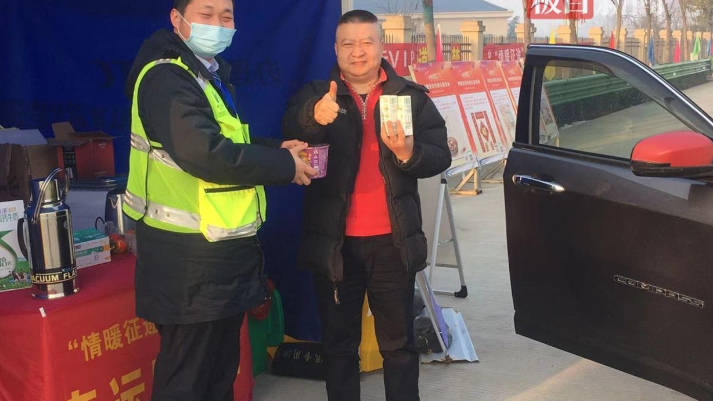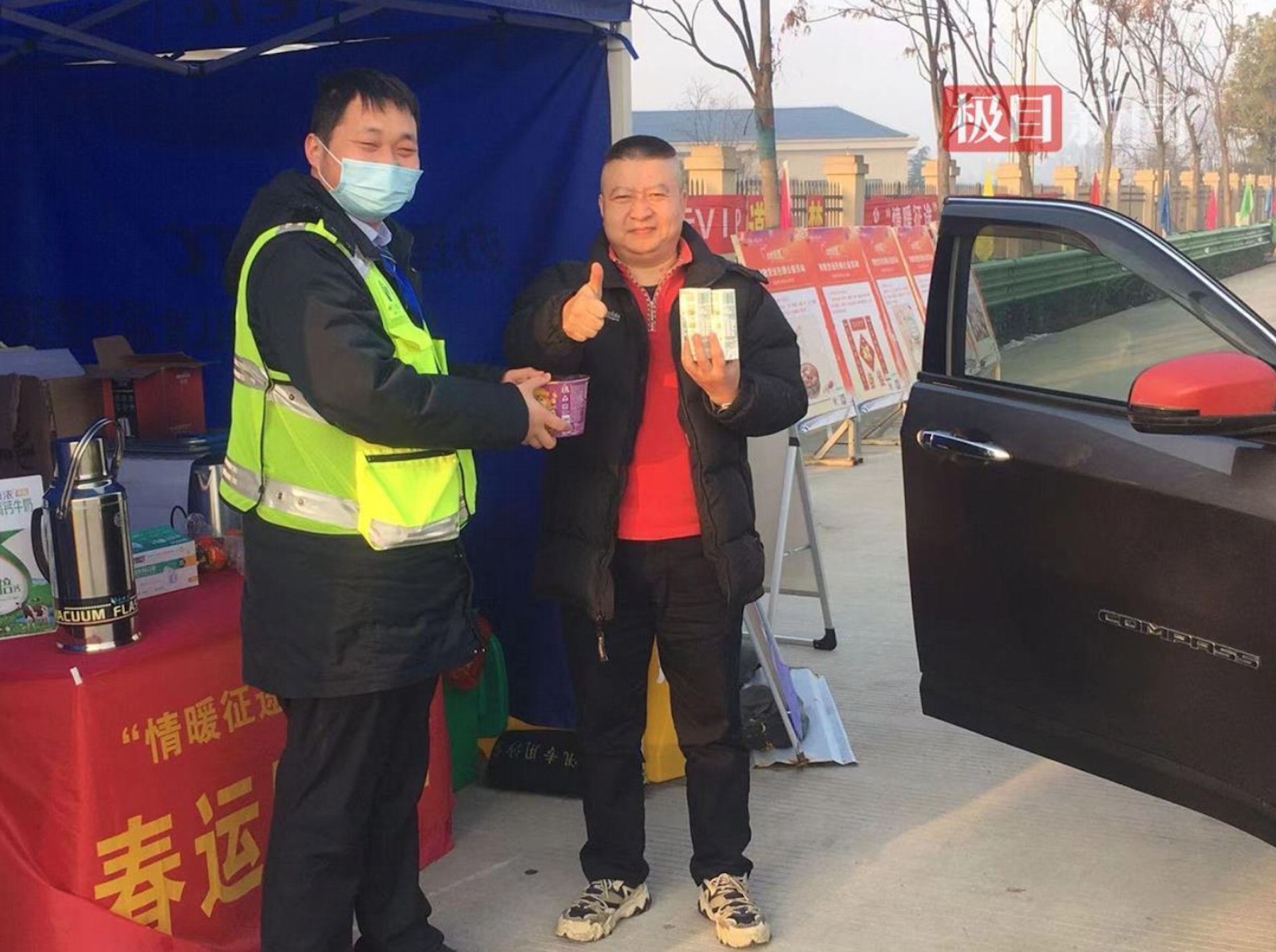 志願者得知原因後,將幾盒牛奶及泡麵遞給司機,「吃喝管飽」。這名男子激動地說:「這一路走來,在其他地方沒有碰到你們這樣熱情的服務,湖北高速的服務是最熱情的!」