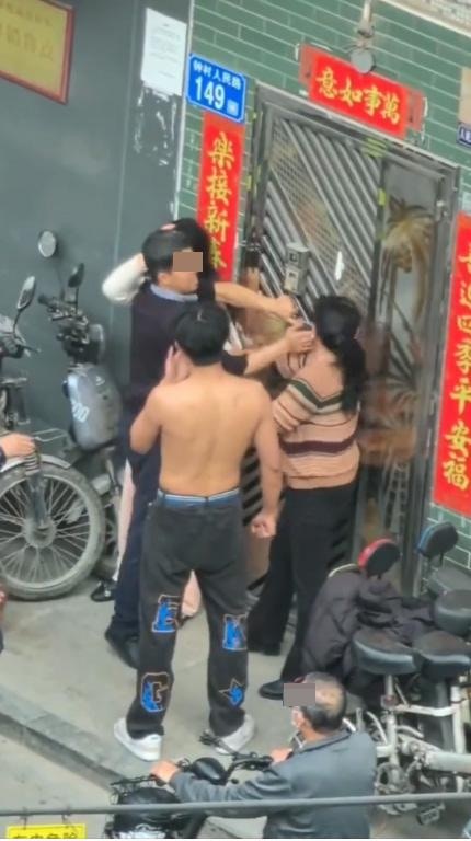 這時父親突然一巴摑在母親臉上,兒子當場爆發狂毆父親,父親則一手護着女友,一手拳打還擊。母親一度想阻止2人打鬥,但遭父親反毆。兒子火氣更盛,把父親鎖頸扭打至倒在地上。母親趁父親「失位」,即時拉扯女友至步履不穩,待女友站穩腳步,與母親互扯頭髮纏鬥,場面相當混亂。
