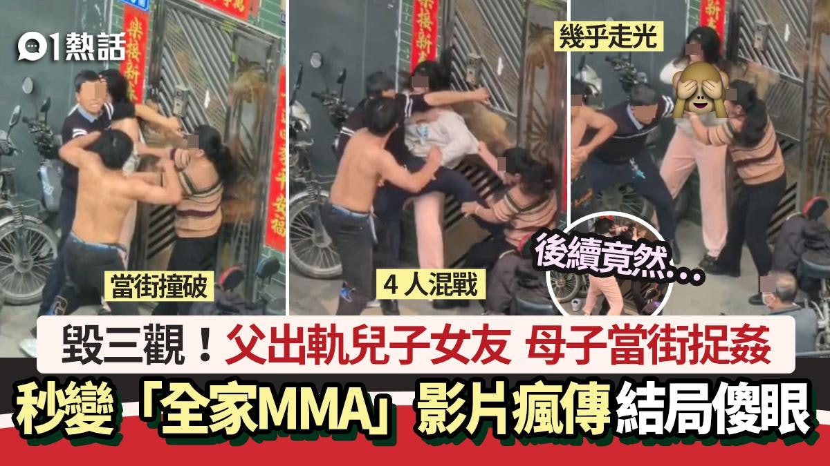 關係好亂!內地網絡瘋傳1段「父子母親MMA」影片,指廣州1名父親出軌兒子女友,被兒子和母親「捉姦」撞破,觸發4人街頭混戰,其間父親一直護着女友,掌摑「正宮」妻子和拳毆兒子,兒子則一輪連環拳暴打反擊。直到警方到場,4人才停手。影片引來網民熱議,「毀三觀!」,也有人笑言「誘其子必誘其父」。) X7 Y7 t( |; G% S