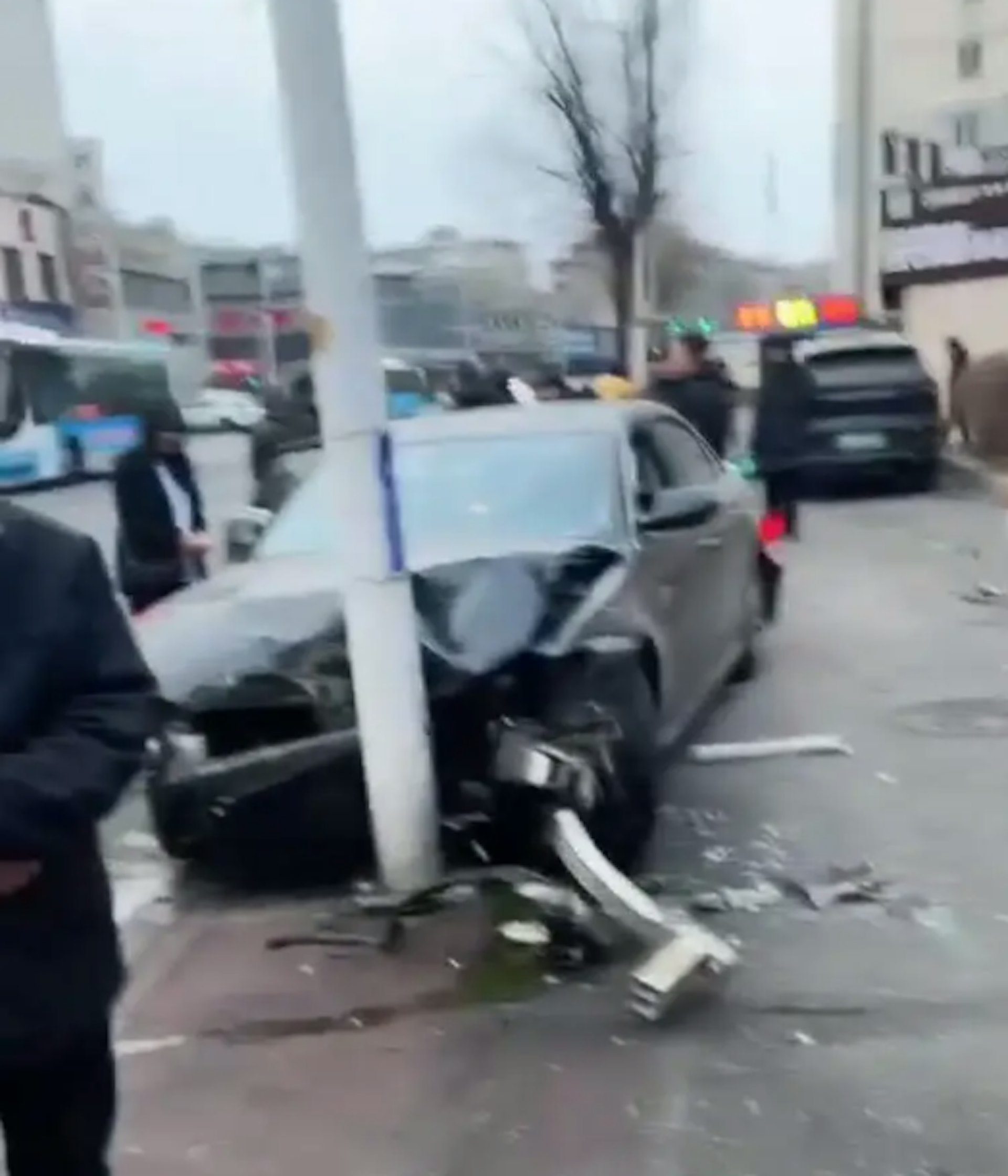 0 `" O4 ~% V8 a# @" }( N- ]遼寧瀋陽一輛黑色轎車逆行撞上燈柱停靠在人行道上,車身受損嚴重。(影片截圖)9 x5 H) l. [1 s& [- V) C