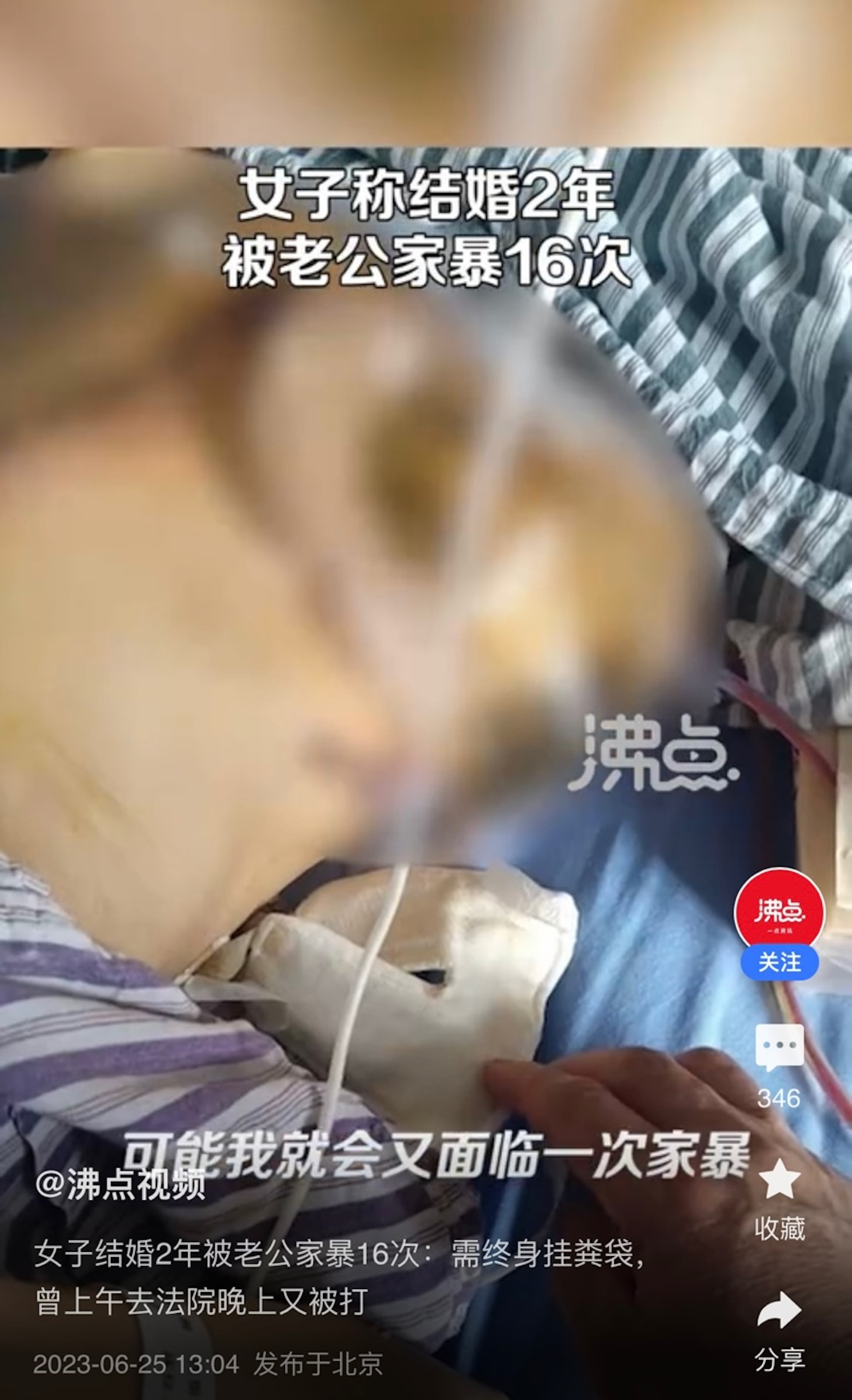 女子結婚2年被丈夫家暴16次,致多臟器損傷,需終身掛糞袋。(圖 / 沸點視頻)