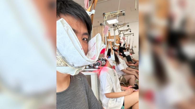 1 d; j/ z6 ^& A「20歲的人,60歲的頸」,內地社交平台近日一張年輕人集體「吊頸照」引起網絡熱議,許多90後、00後,也紛紛出來分享「吊頸」經驗。新一代在工作或娛樂需要下,大多也不得不低頭,令導致頭暈、頸痛、上肢發麻、下肢乏力的頸椎病,越來越年輕化,需要通過頸部牽引來治療,出現醫療機構後生仔女集體「吊頸」的壯觀畫面。