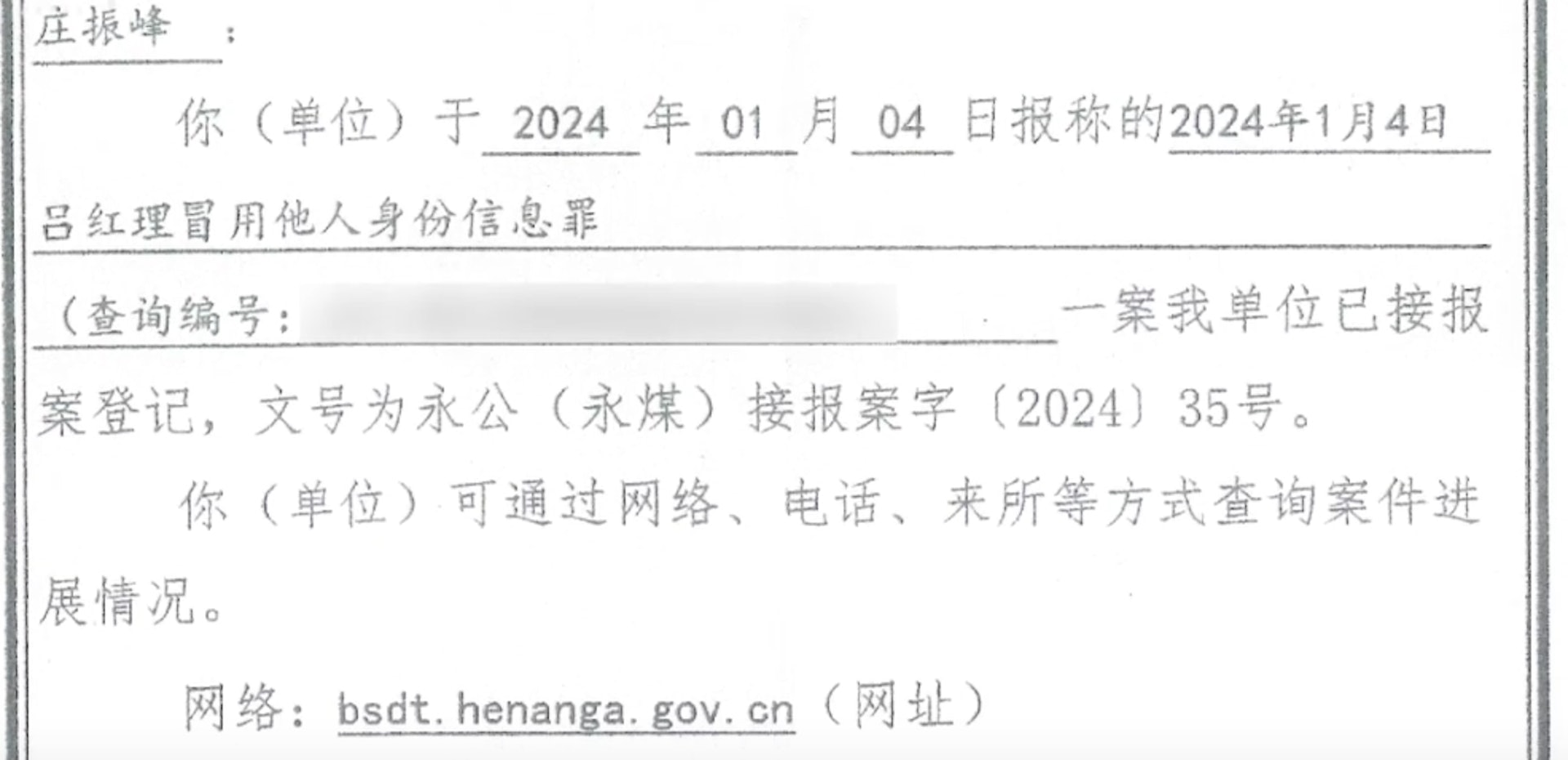 . Q4 n* K. n% I6 _ U$ m公仔箱論壇莊振峰的報案回執。(澎湃新聞)