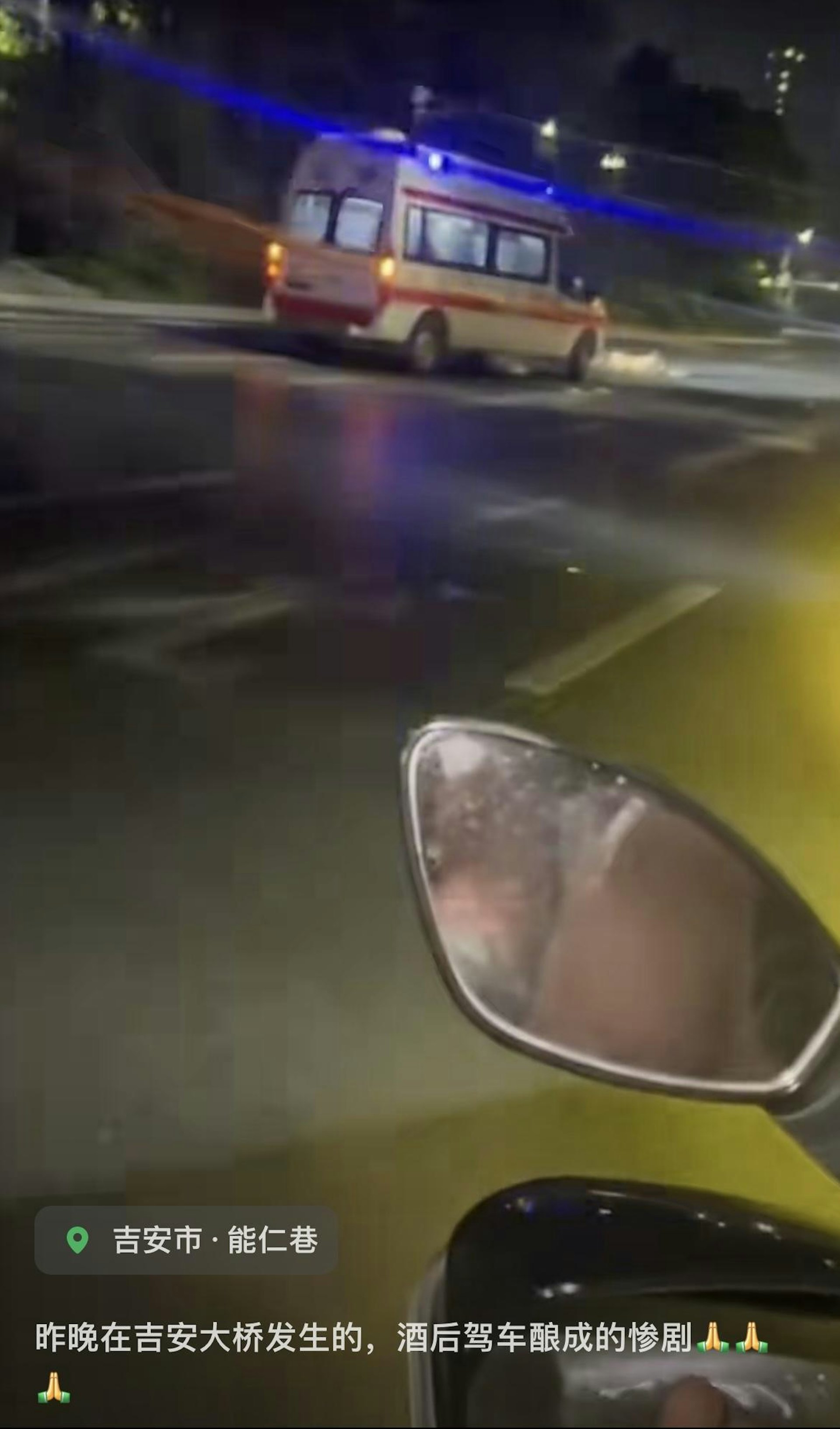 網傳閉路電視片段顯示,事發時間為9月3日凌晨3時許,一處大橋上,兩名騎手正在騎行,後方一輛私家車在彎道處轉彎後變道疑似未減速,直接將這兩名騎手撞飛。有江西網民在評論中指出,事發江西吉安某大橋,且該名司機涉及酒駕。