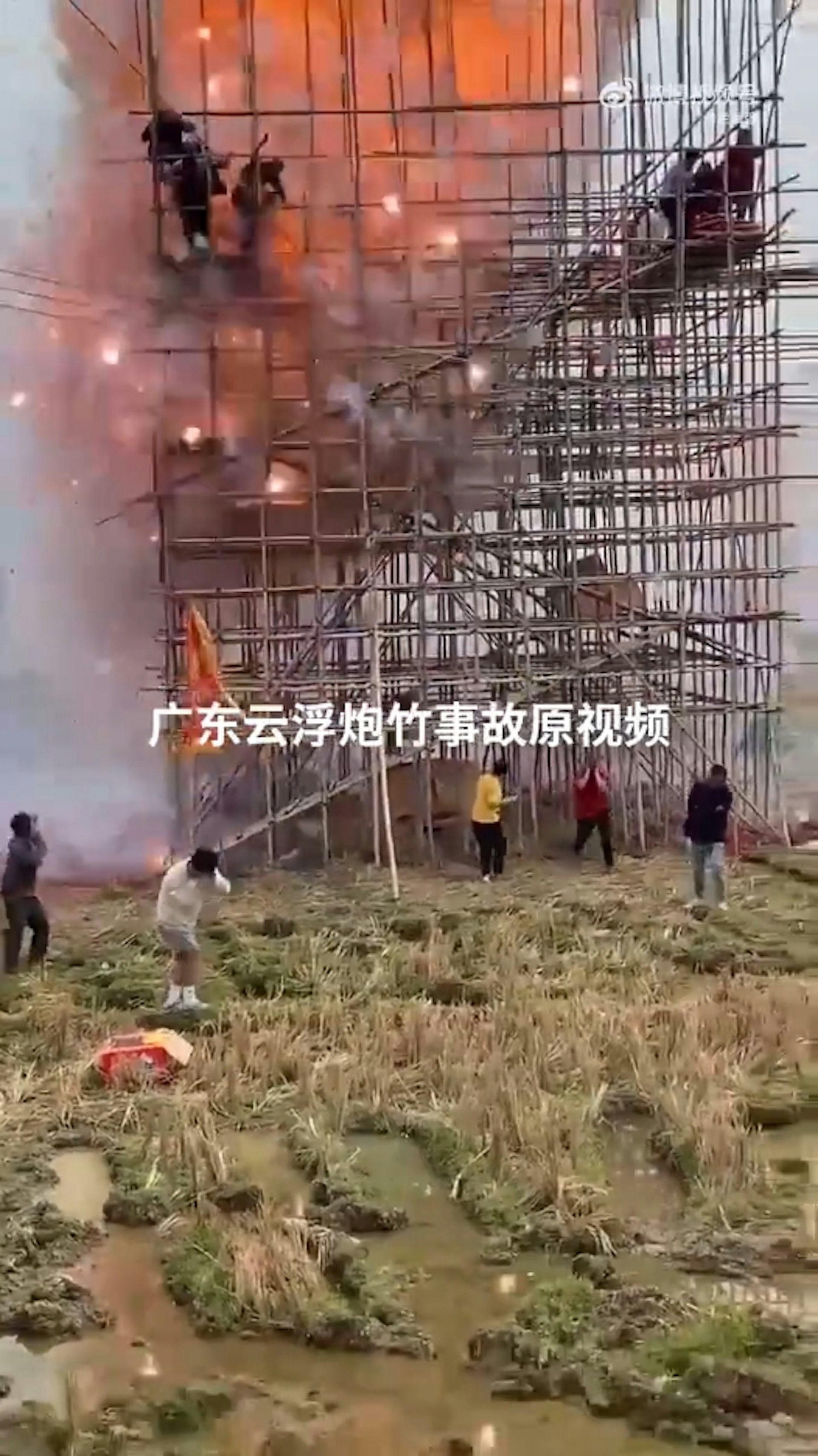 影片顯示,多名村民站在用竹搭建的數米「炮台」上,一名村民點燃爆竹後,不慎引燃高台上其他的爆竹。大量爆竹瞬間炸響,高台上多人來不及躲閃,踉踉蹌蹌爬走,其中一人疑失足從高處墮下,有村民疑被灼傷,不停在泥水中打滾。