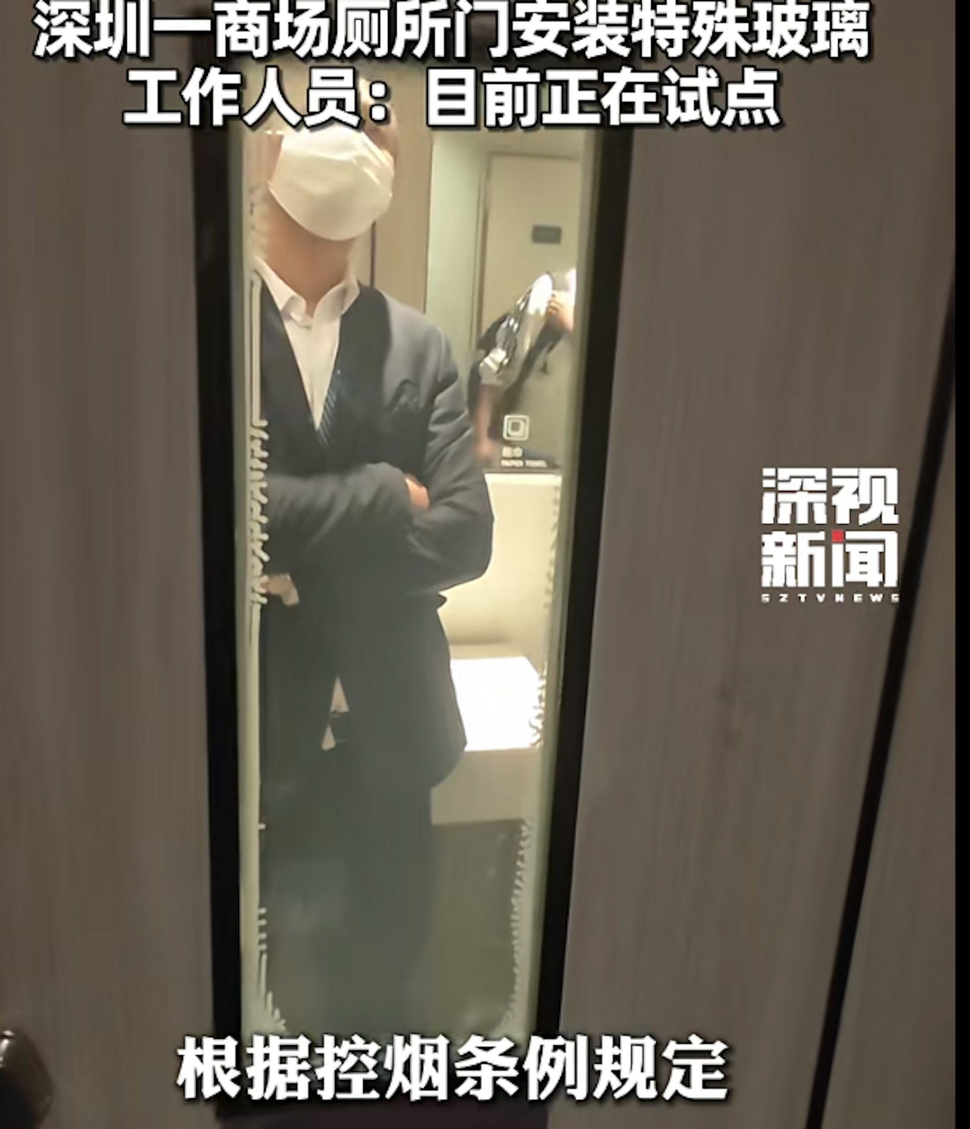 綜合內媒報道,有網民在深圳羅湖商場的男廁所拍到了一扇特殊的門,上面寫着「吸煙將使玻璃門變透明」,有人表示支持商場做法,但也有民眾認為該行為可能侵犯個人私隱。
