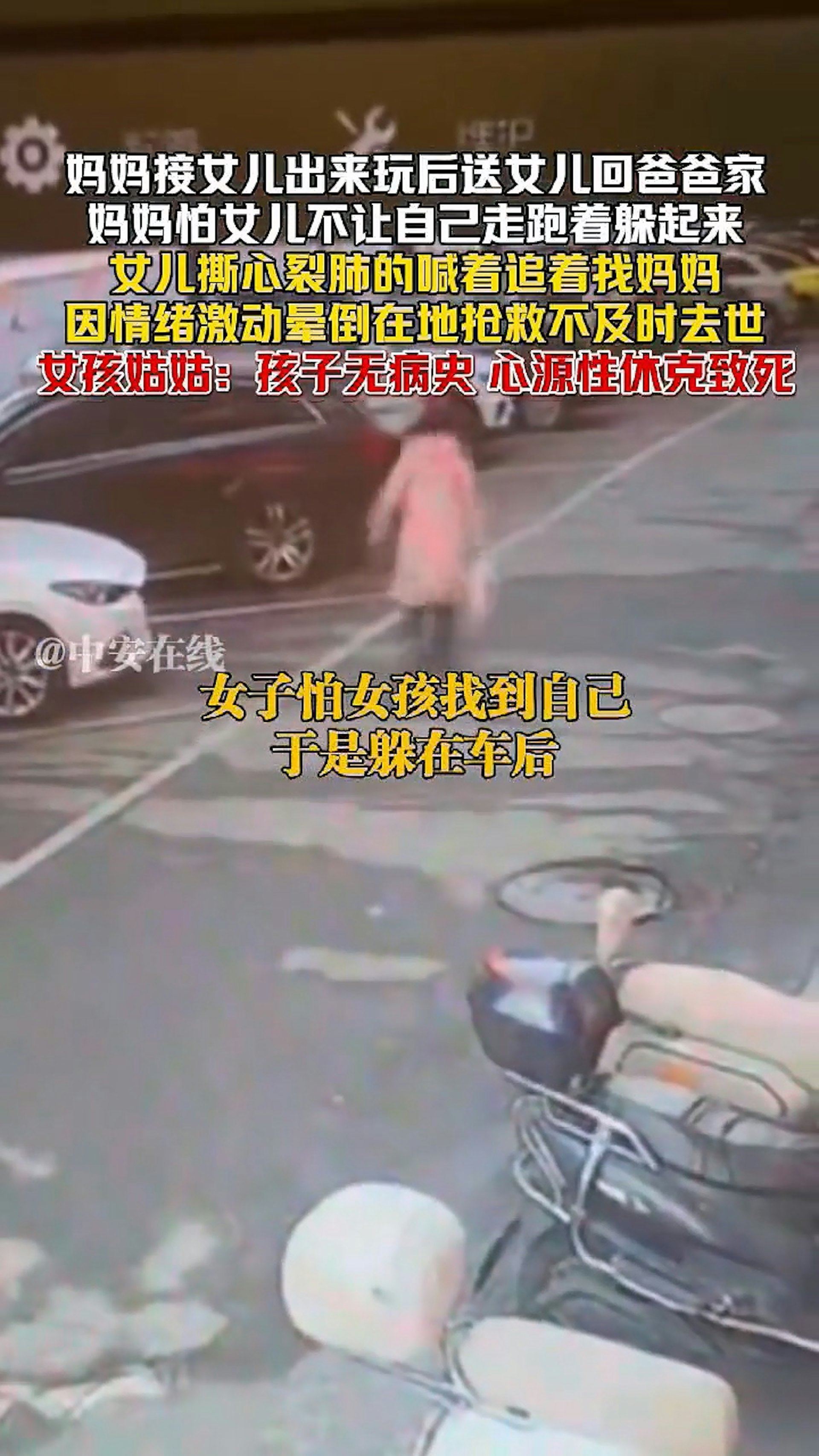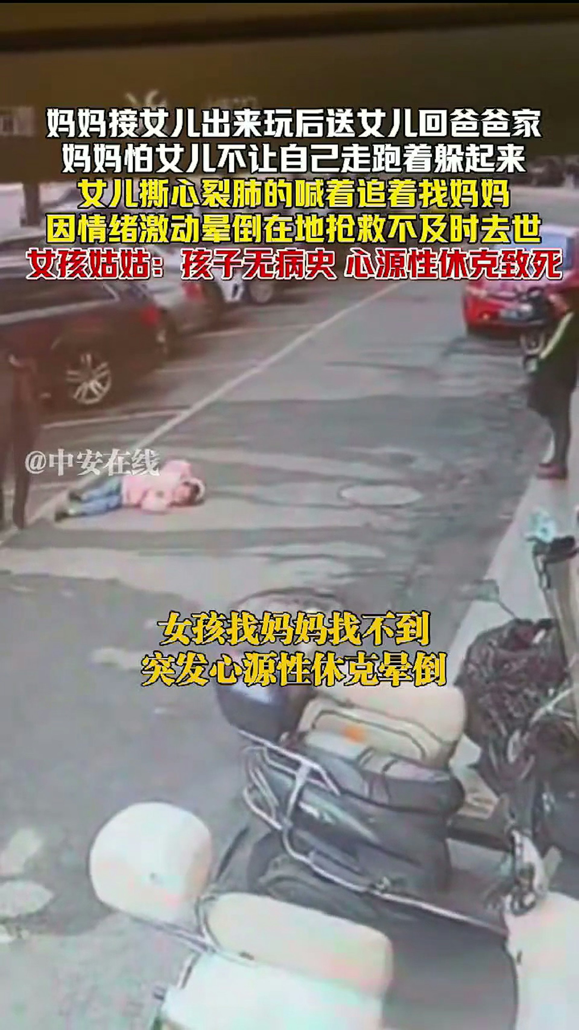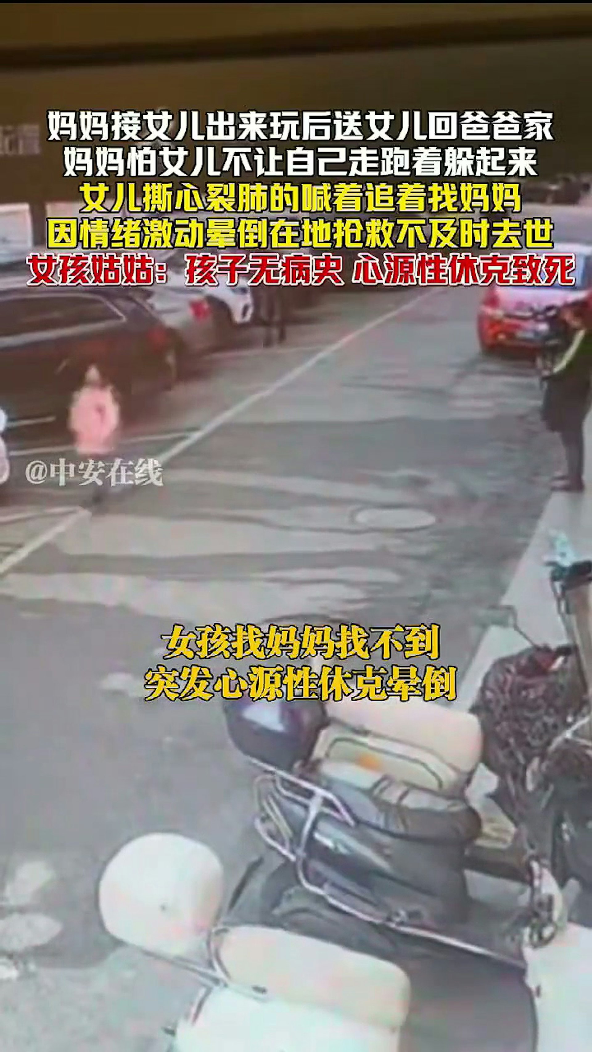 湖南一名女童的雙親離異,媽媽11日帶女兒出去玩,臨別時要把孩子送回前夫家,擔心女兒捨不得自己,便躲起來不讓孩子找到,沒想到女兒撕心裂肺追趕母親,又找不到人,情緒崩潰、太過激動,竟當場心因性休克暈厥,搶救不及身亡。(截取自微博@中安在線)