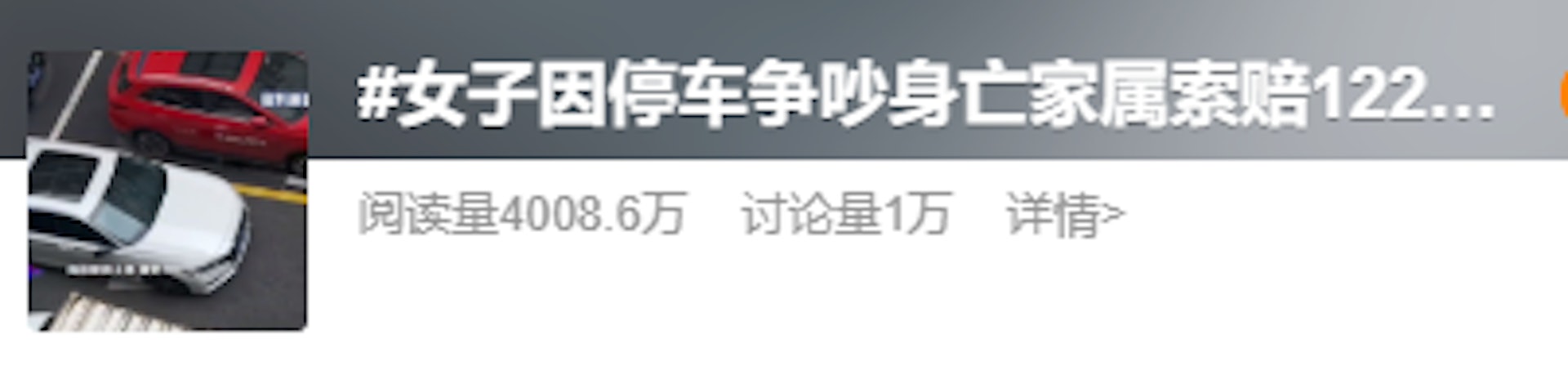 ; ~; A$ ]4 o- F. |6 R9 X3 Z「女子因停車爭吵身亡家屬索賠122萬」話題登上熱搜。(微博)