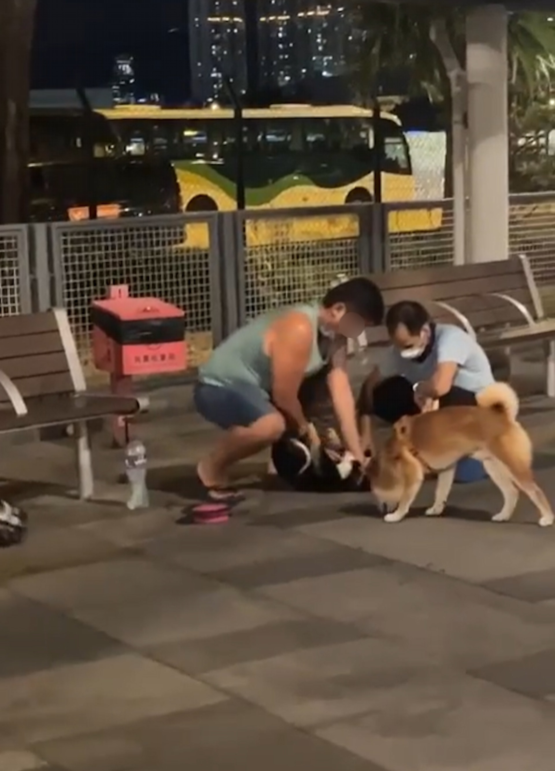 網上流傳1段影片,顯示有男子日前於宋皇臺遊樂場寵物公園,大力捏緊1隻柴犬的頸部,並將牠按在地上,柴犬不斷發出淒厲的叫聲。(FB「香港貓狗及寵物報料區-(義工/被虐/失蹤/目擊/領養) 」圖片)